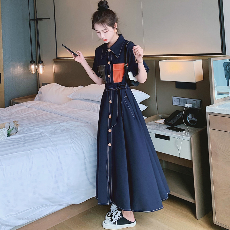 设计感复古休闲撞色翻领系带短款连衣裙夏新款时尚气质大摆裙
