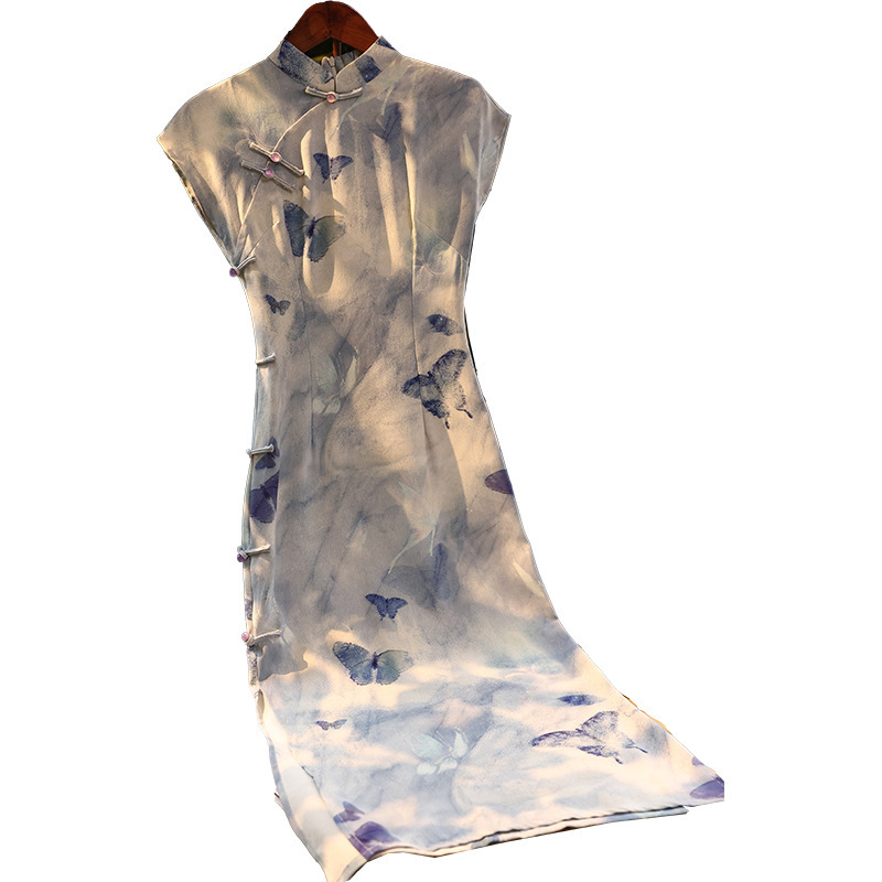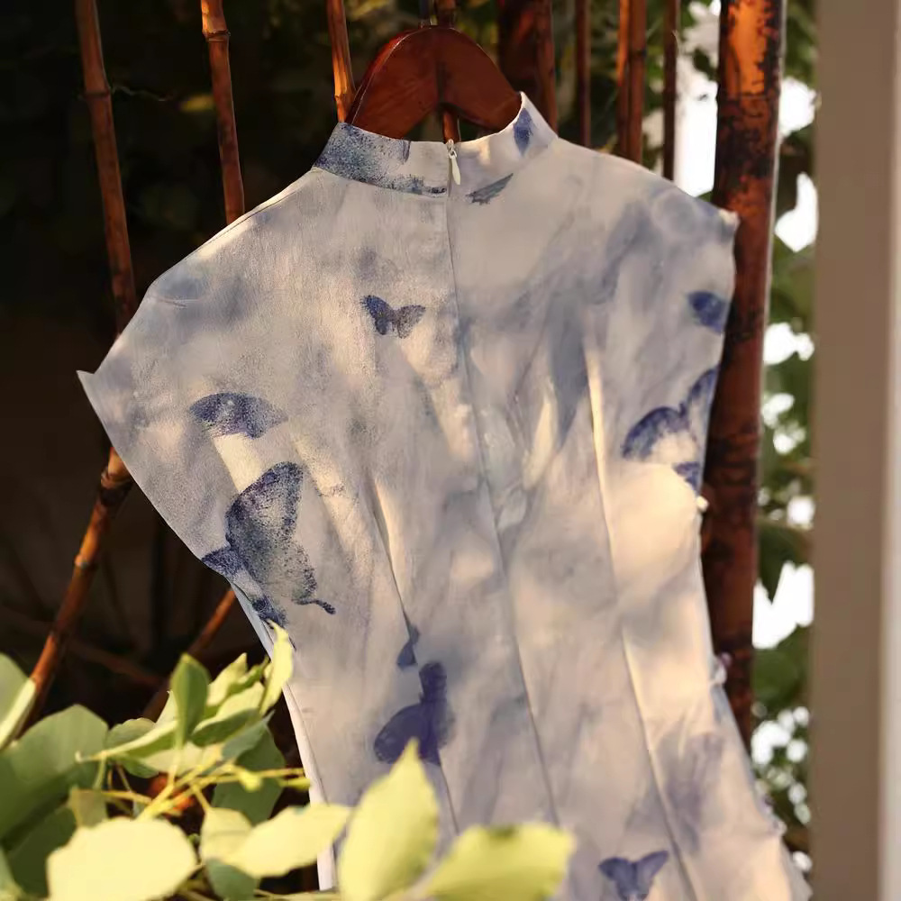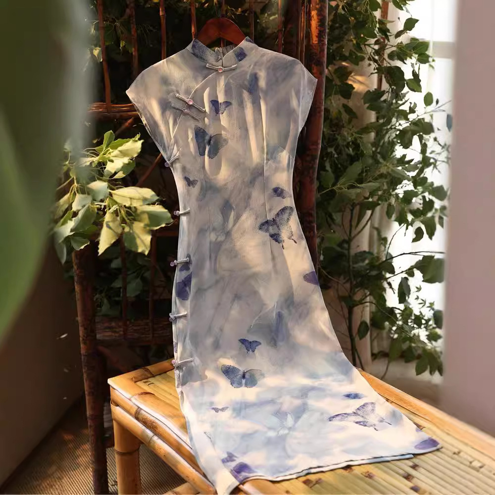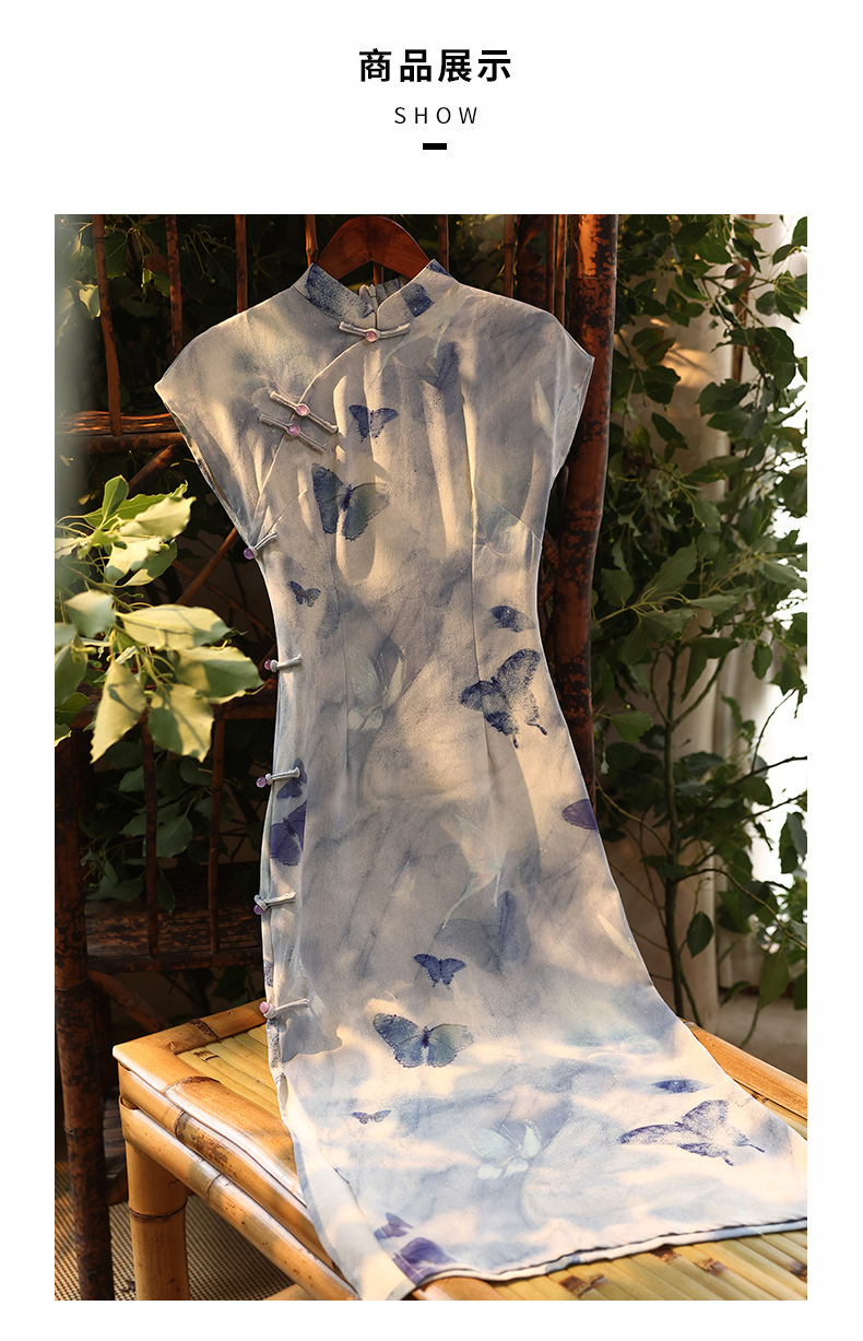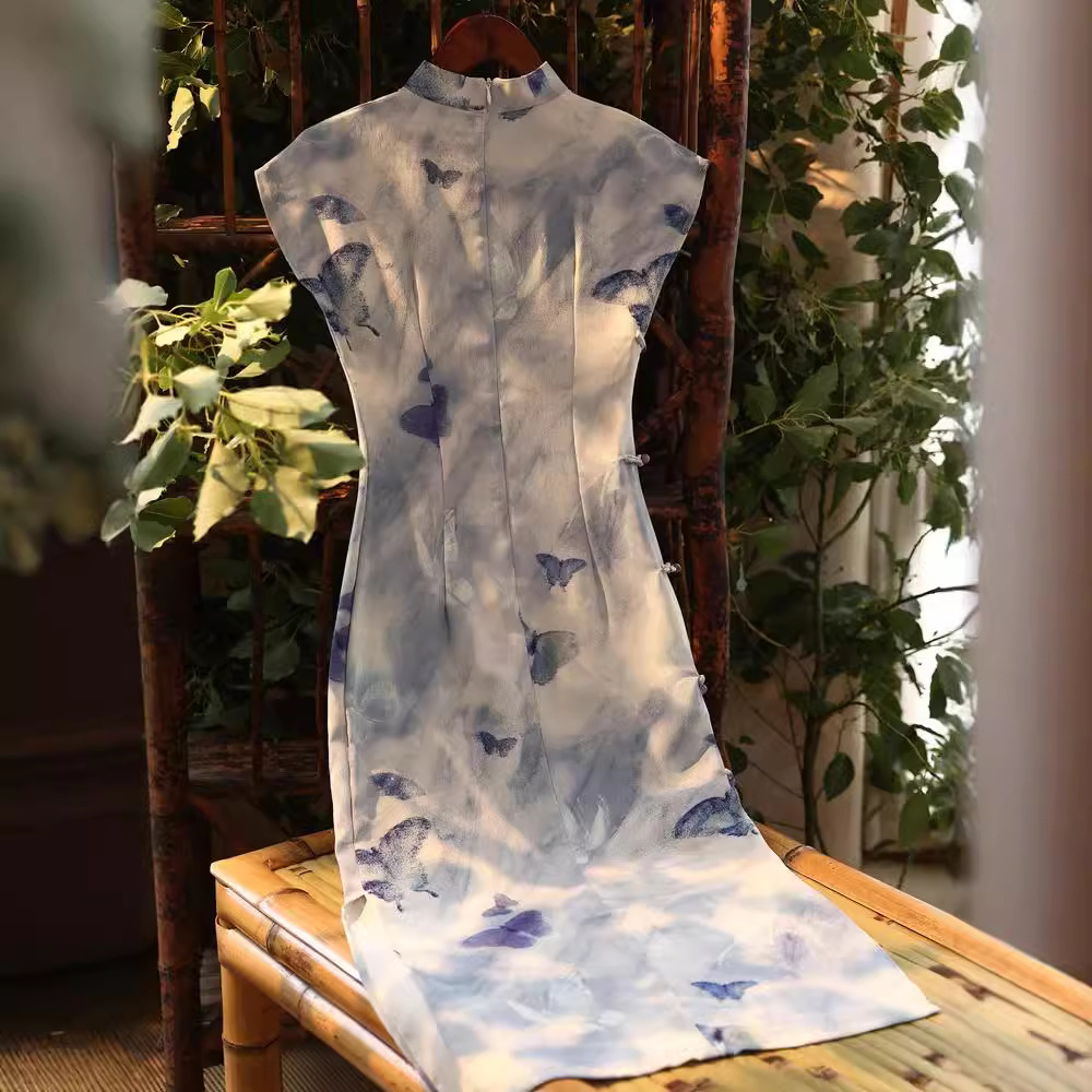 复古民国风蓝色短袖旗袍改良新中式年夏季新款日常可穿