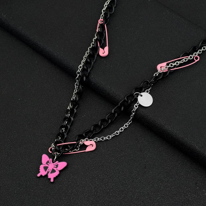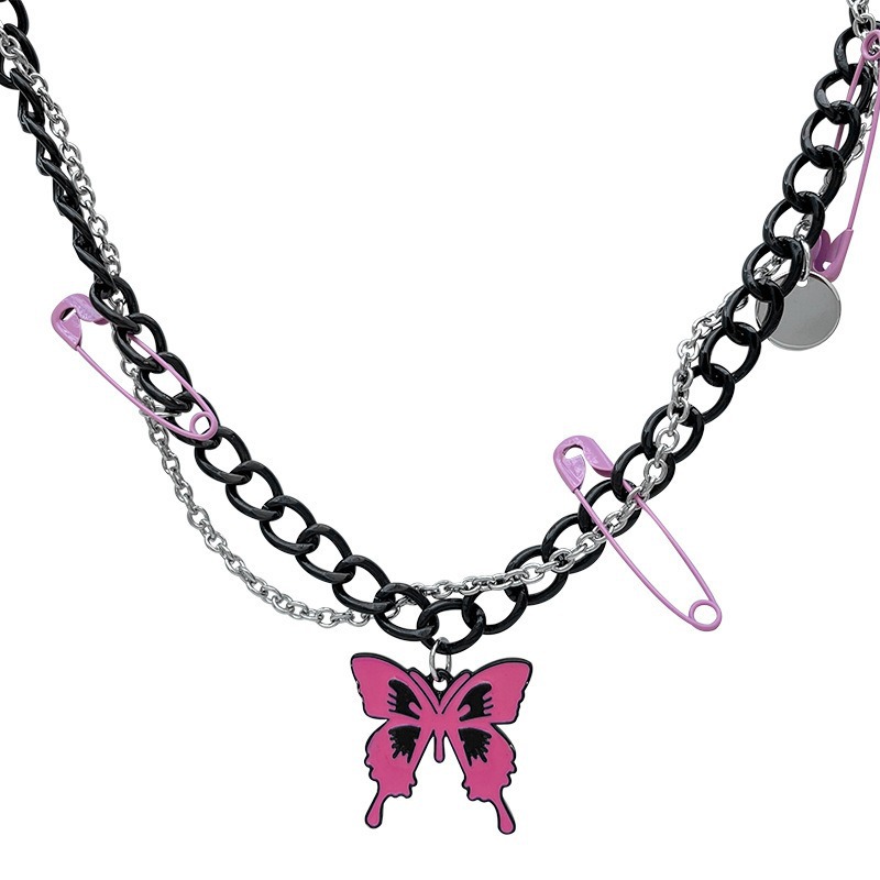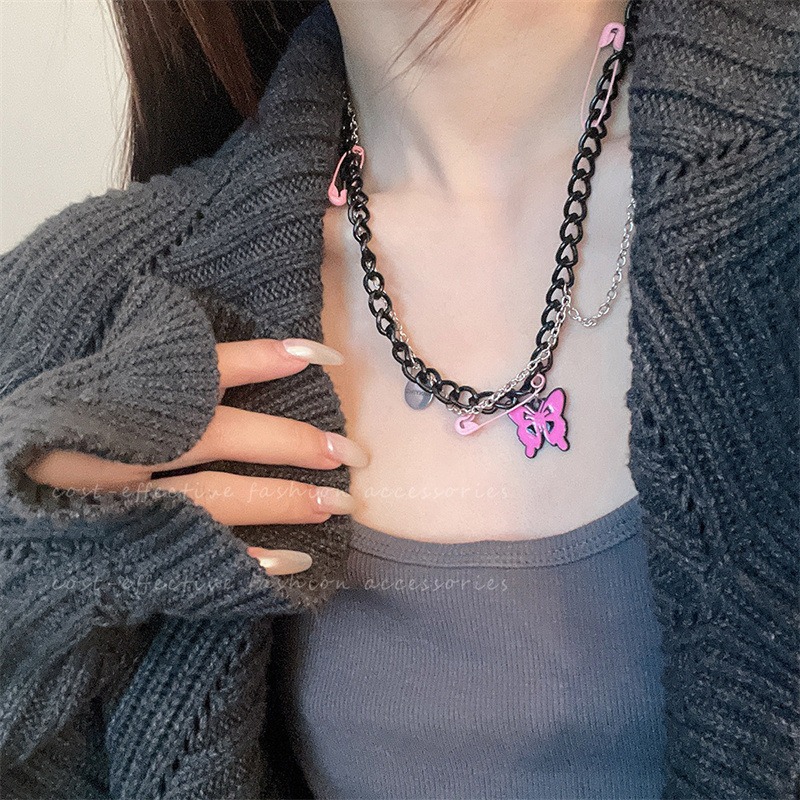 黑色别针蝴蝶吊坠项链女甜酷辣妹风y2k双层叠戴小众高级感锁骨链