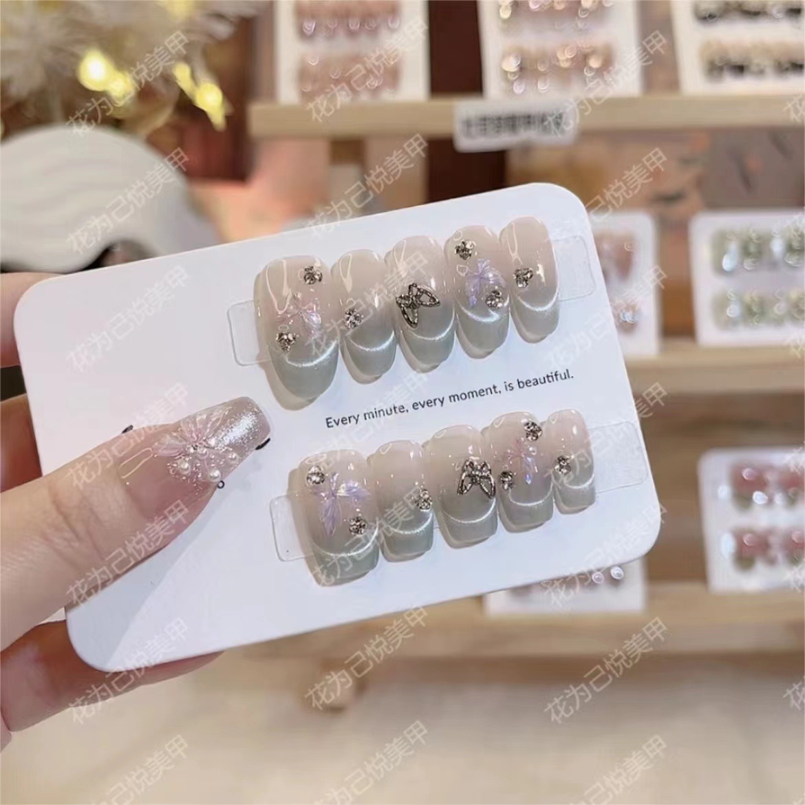 纯手工光疗穿戴甲薄荷曼波批发成品重复使用美甲贴片可拆卸猫