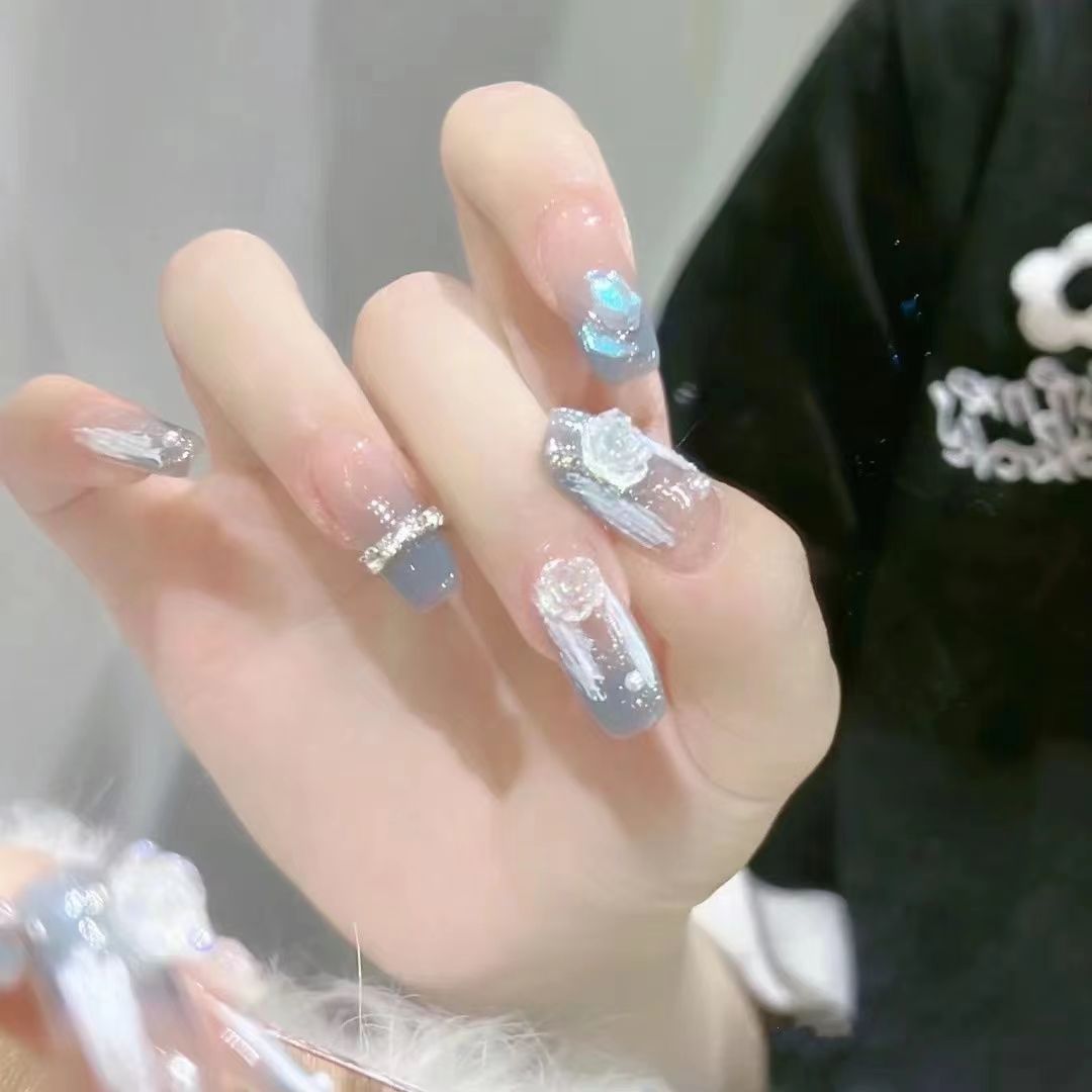 纯手工穿戴甲蓝色山茶花春雨渐变美甲温柔仙女风显白指甲贴片可拆