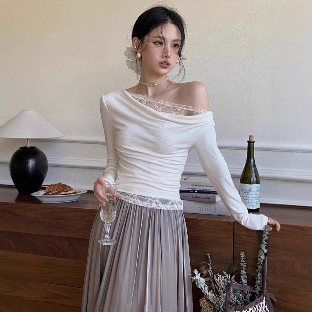 2025新款蕾丝拼接斜肩打底衫T恤女秋新款设计感显瘦内搭短款上衣