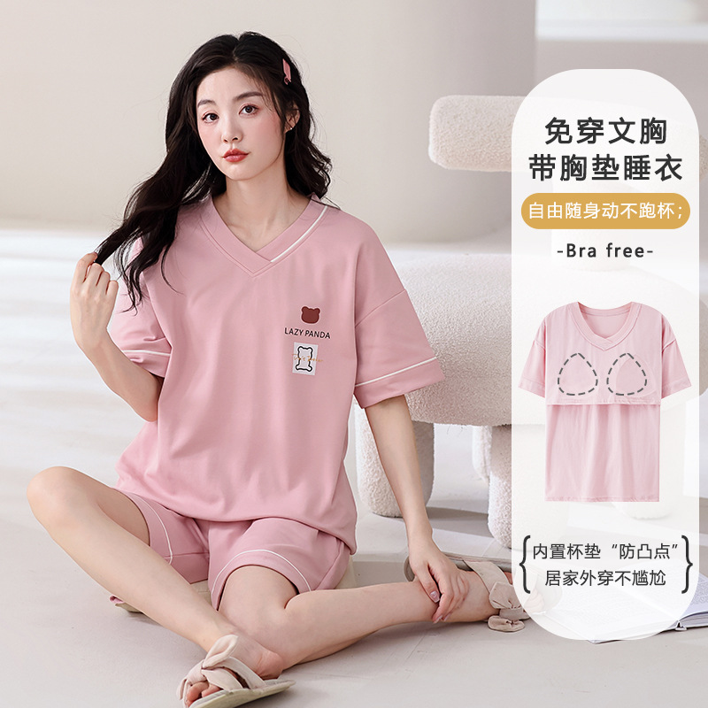 睡衣女夏季薄款纯棉短袖短裤带胸垫一体防凸点外穿全棉家居服套装