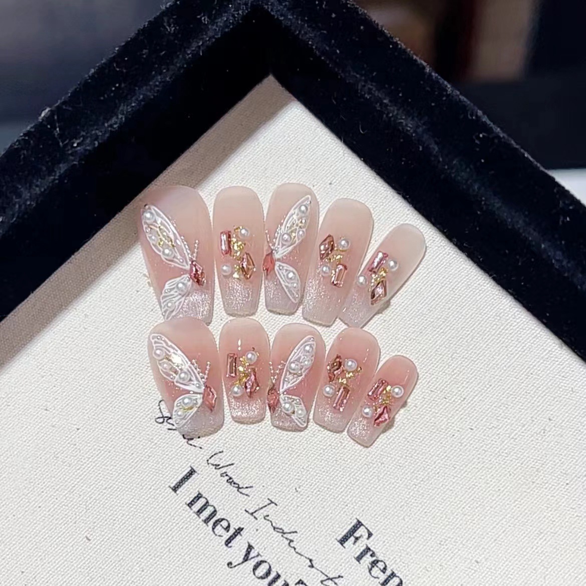 纯手工光疗穿戴甲蝶恋月光原批发成品重复使用美甲贴片可拆卸猫