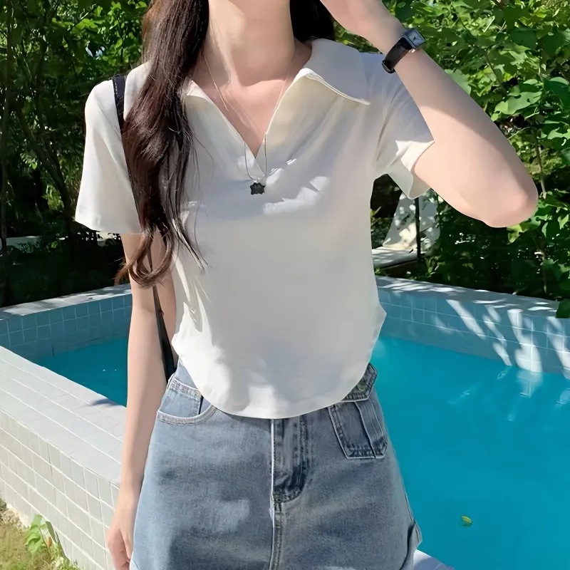 白色不规则polo领短袖t恤女夏季设计感小众修身短款正肩上衣