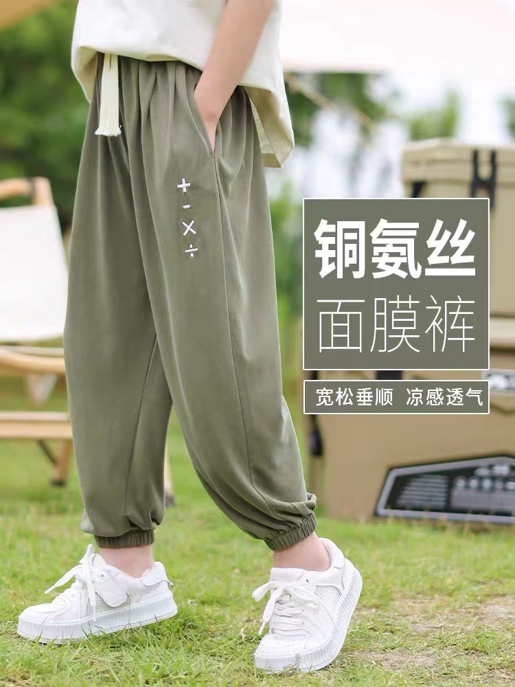 男童夏款裤子冰丝裤儿童铜氨丝防蚊裤宽松大童夏装面膜裤绿色长裤