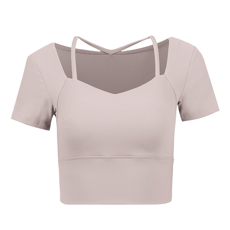 带胸垫瑜伽上衣女夏季薄款紧身健身服露脐T恤透气跑步运动短袖