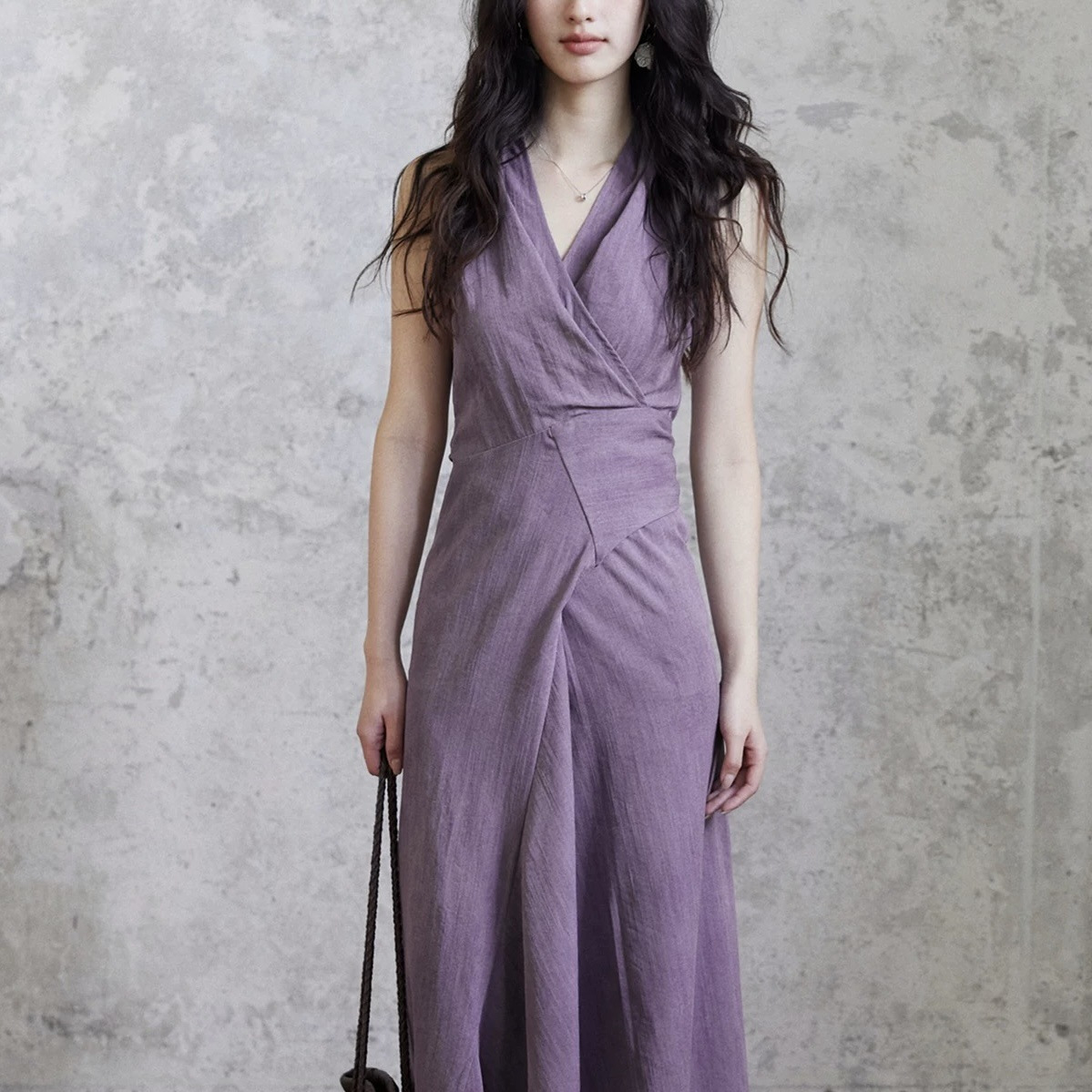【青宛】气质紫色v领挂脖长裙女绑带设计感连衣裙子