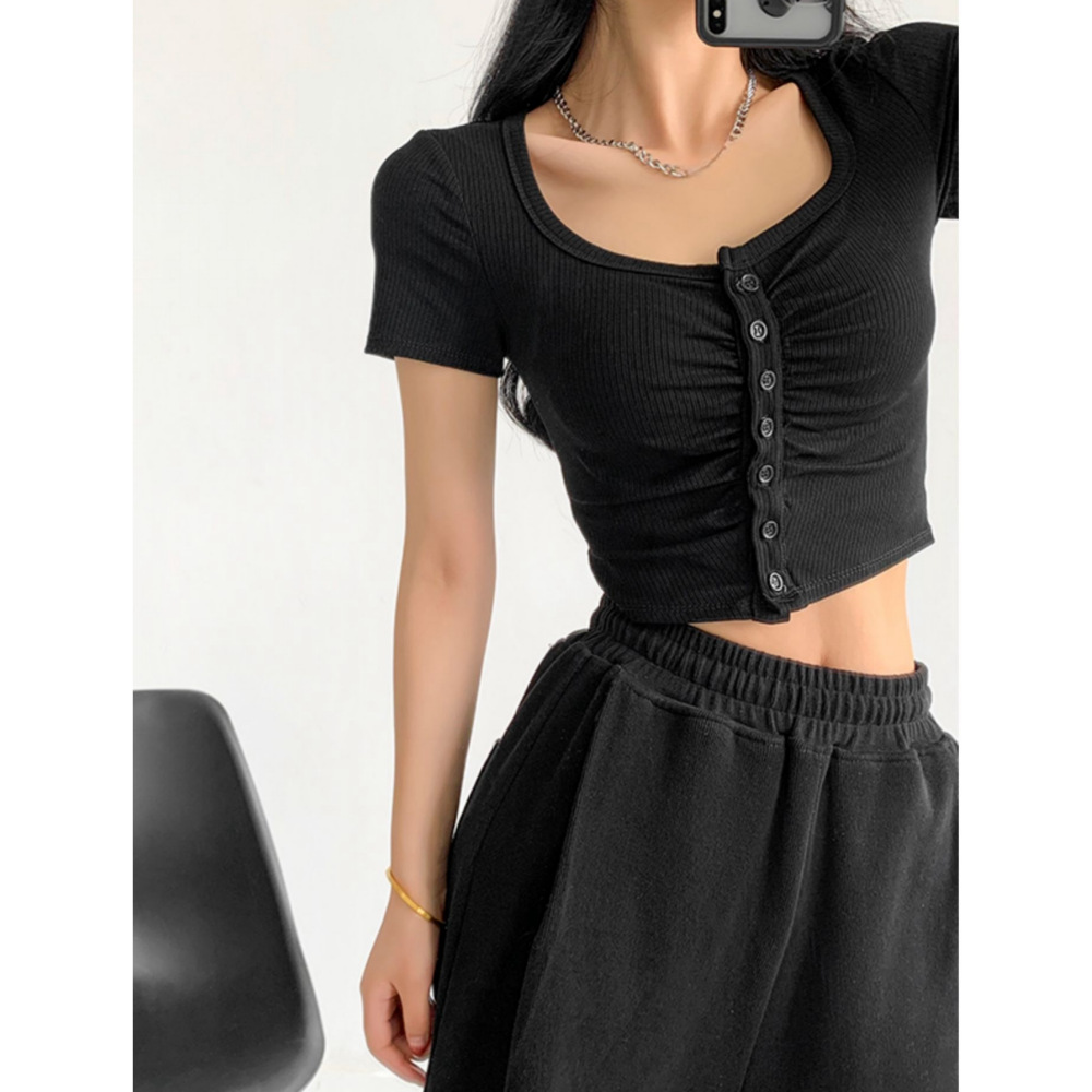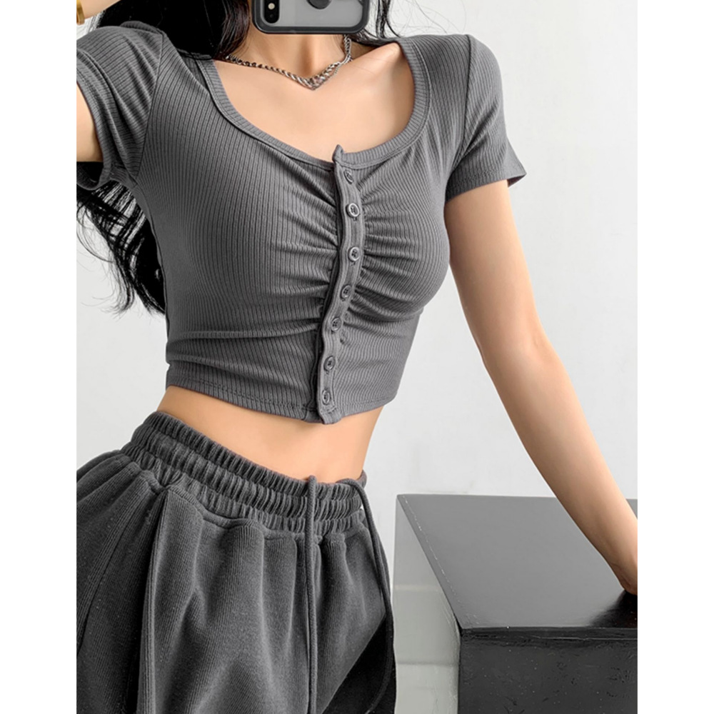 褶皱辣妹风短袖T恤女纽扣运动休闲显胸显瘦瑜伽短款露脐上衣