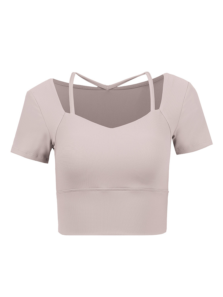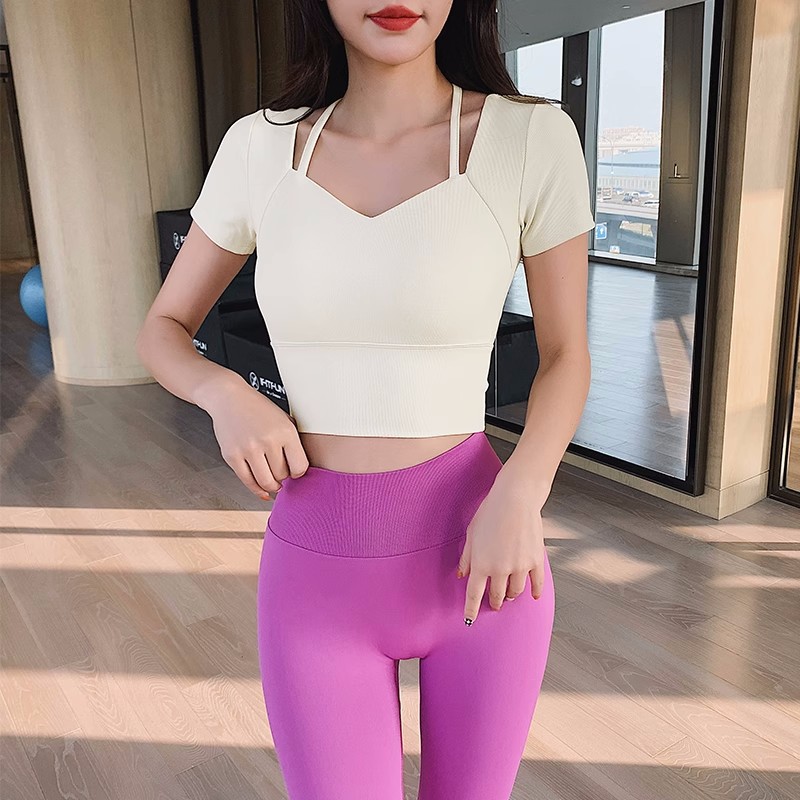春夏新款含胸垫运动上衣女性感修身瑜伽服短款短袖健身服健身衣