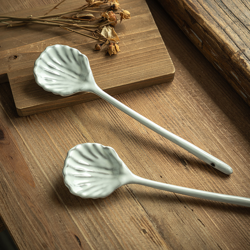 独特少有款长柄扇贝勺浮雕陶瓷勺子家用餐具调羹饭店创意餐勺