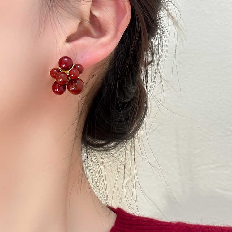 S925银针法式轻奢风红色烟花珍珠耳钉气质时尚新年喜庆葡萄耳环女