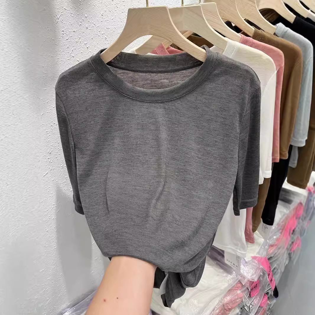 夏爆款简约冰丝薄款面膜T宽松显瘦短袖女休闲灰色随性上衣