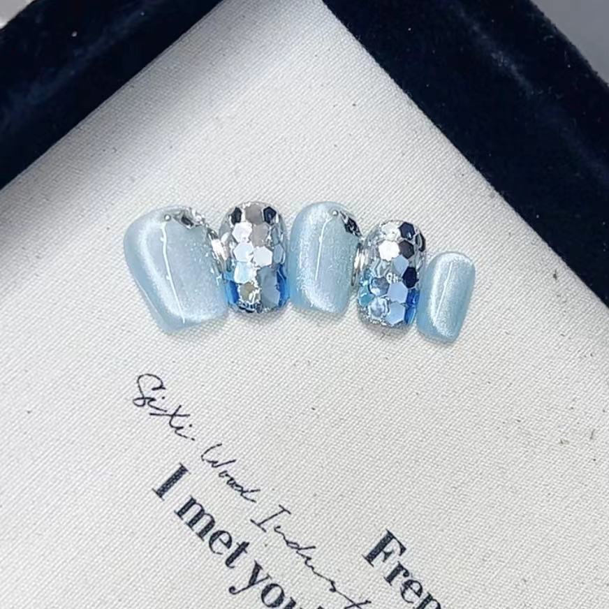 纯手工光疗穿戴甲冰川蓝岛 批发成品重复使用美甲贴片可拆卸