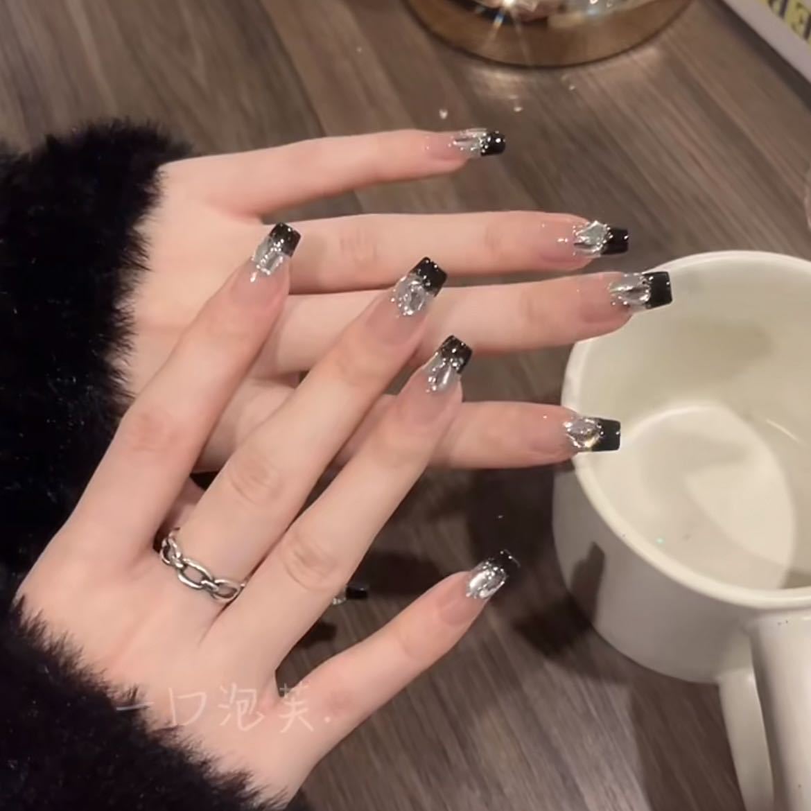 纯手工光疗穿戴甲黑色爆闪亮钻批发成品重复使用美甲贴片可拆卸猫