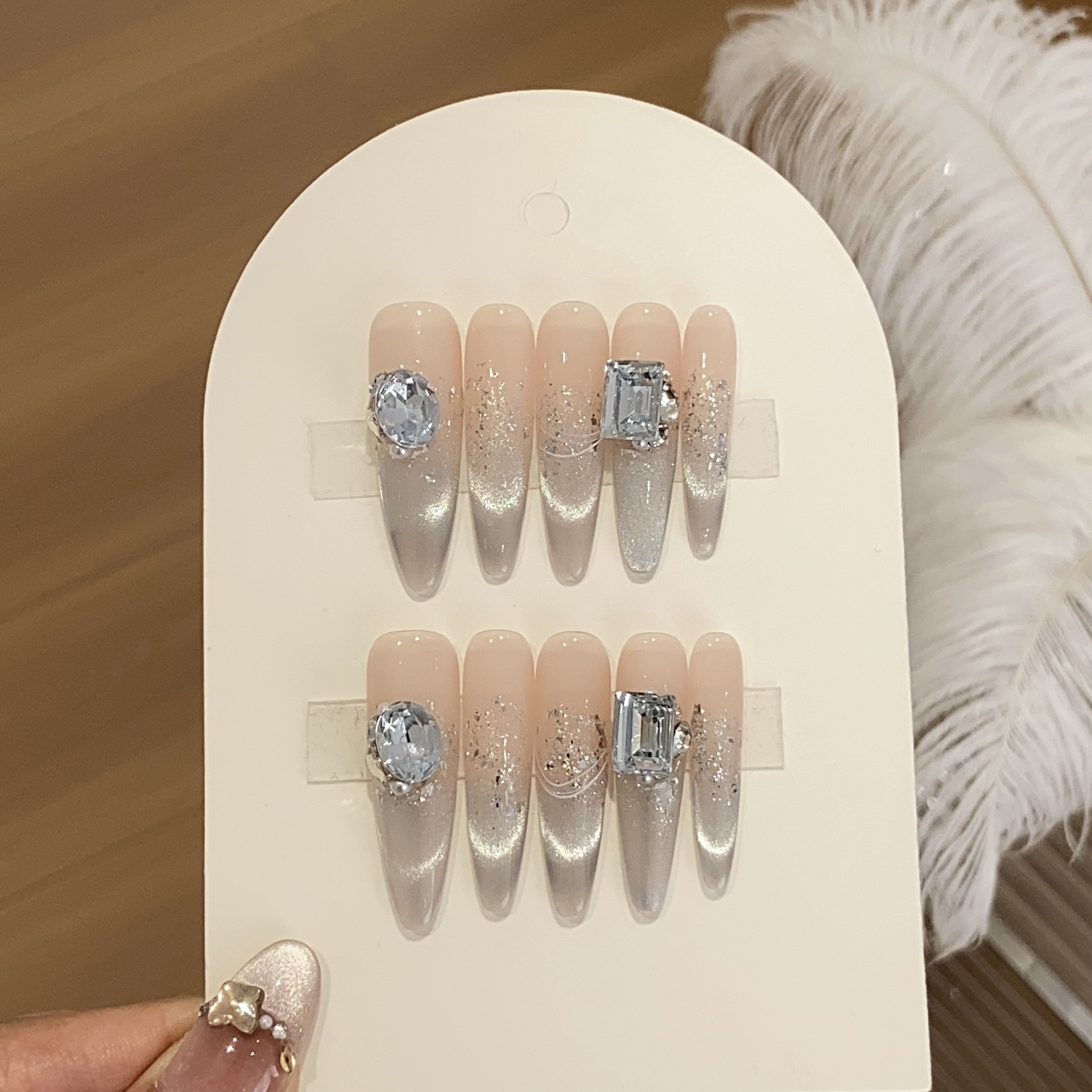 一只顾美甲 手工裸色渐变法式猫眼亮片堆堆圆钻方钻浅青兰穿戴甲