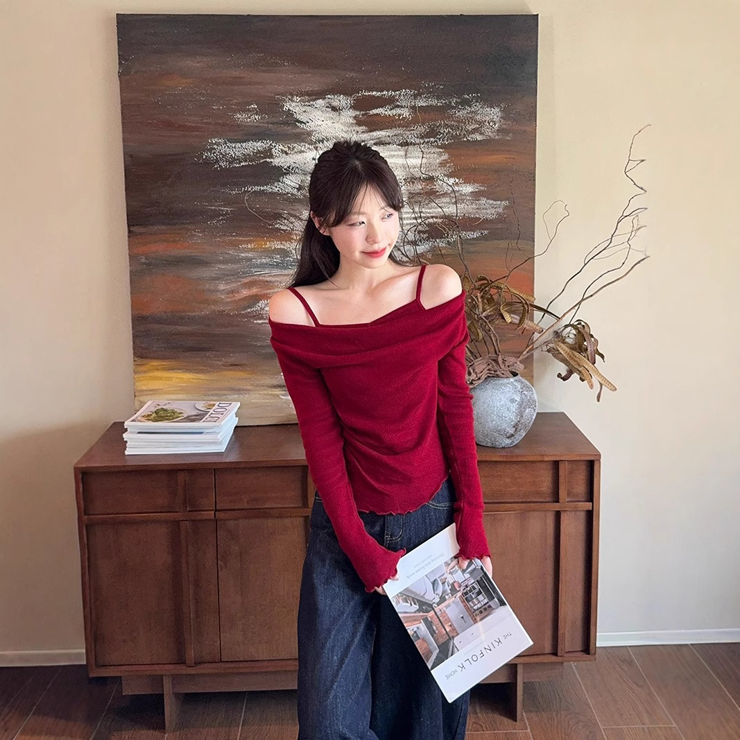 纯欲红茶风穿搭假两件荡领针织衫女秋季木耳边一字肩chic长袖上衣