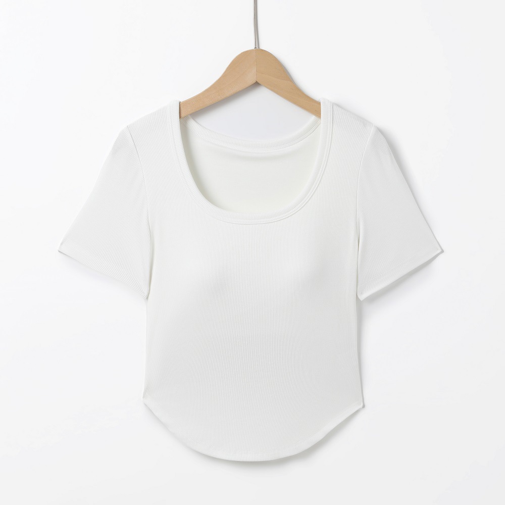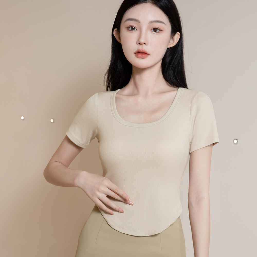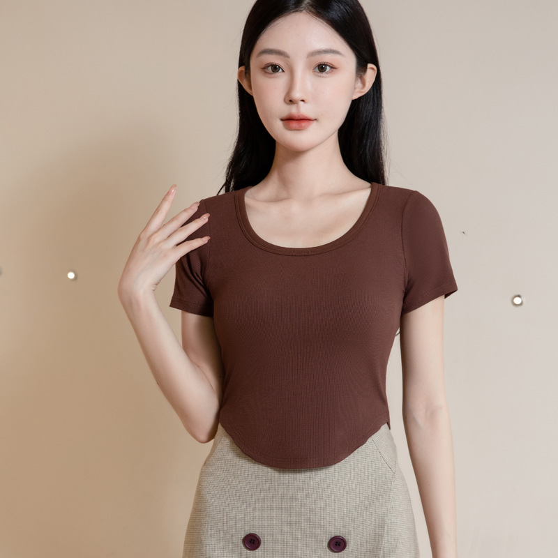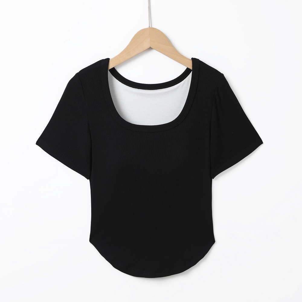 韩版潮流圆领短袖带胸垫一体式圆下摆齐腰打底衫休闲百搭T恤女