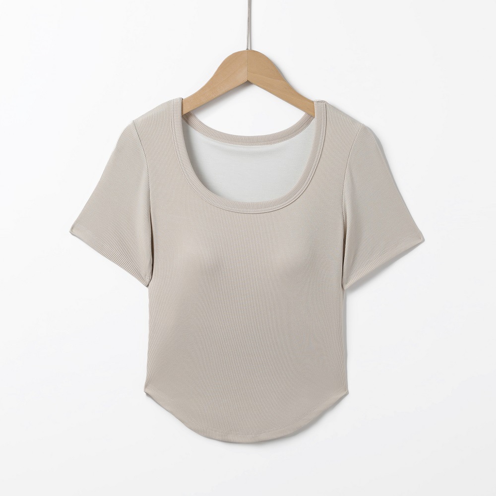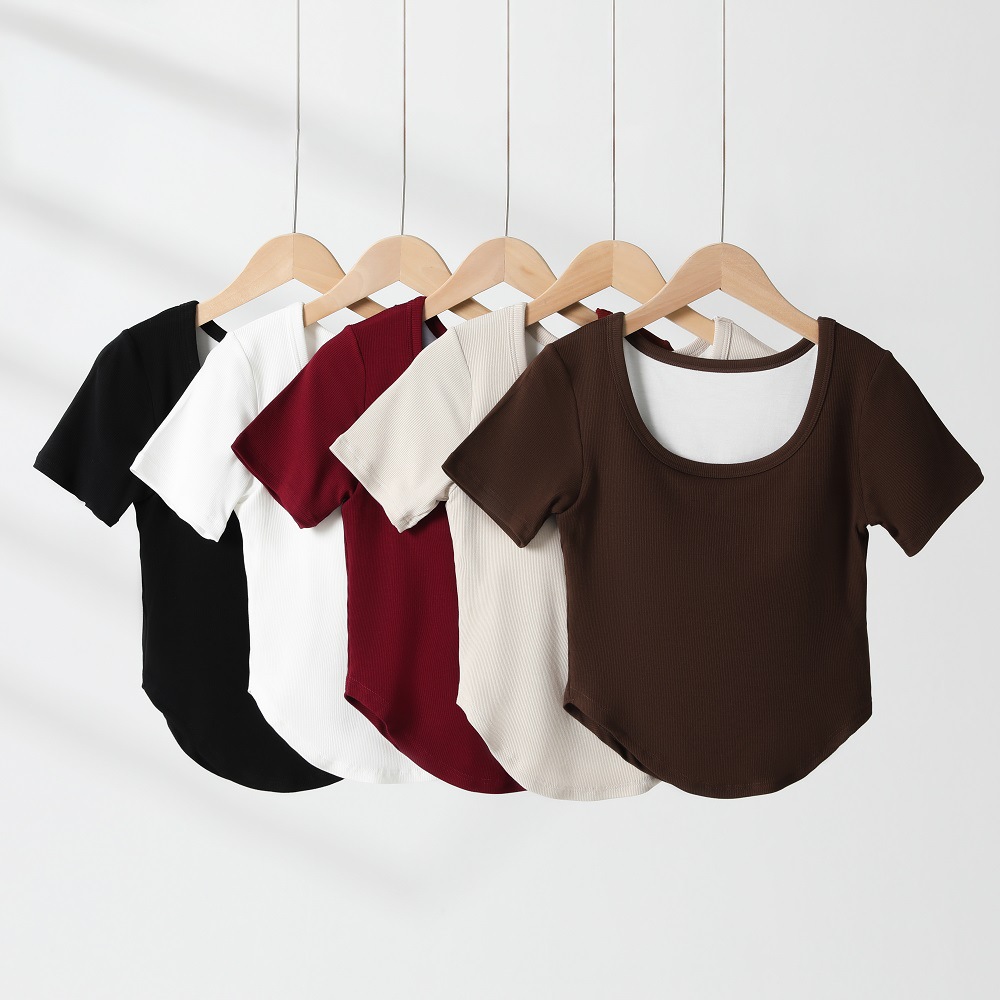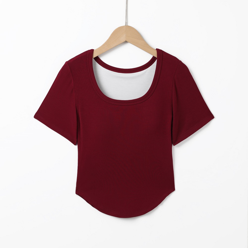 韩版潮流圆领短袖带胸垫一体式圆下摆齐腰打底衫休闲百搭T恤女