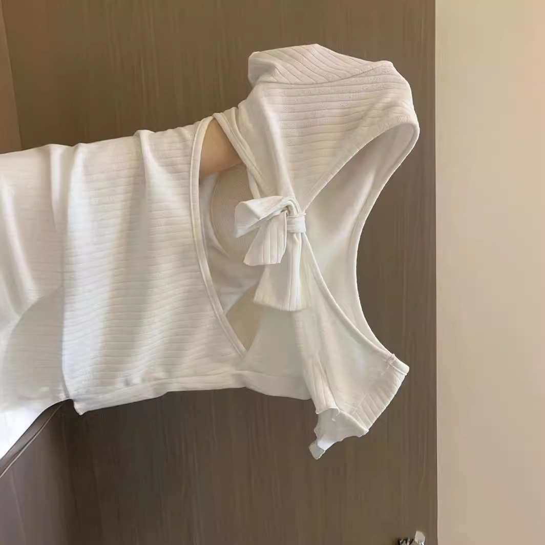 纯欲风正肩短袖t恤女夏季修身辣妹镂空美背打底衫带胸垫短款上衣