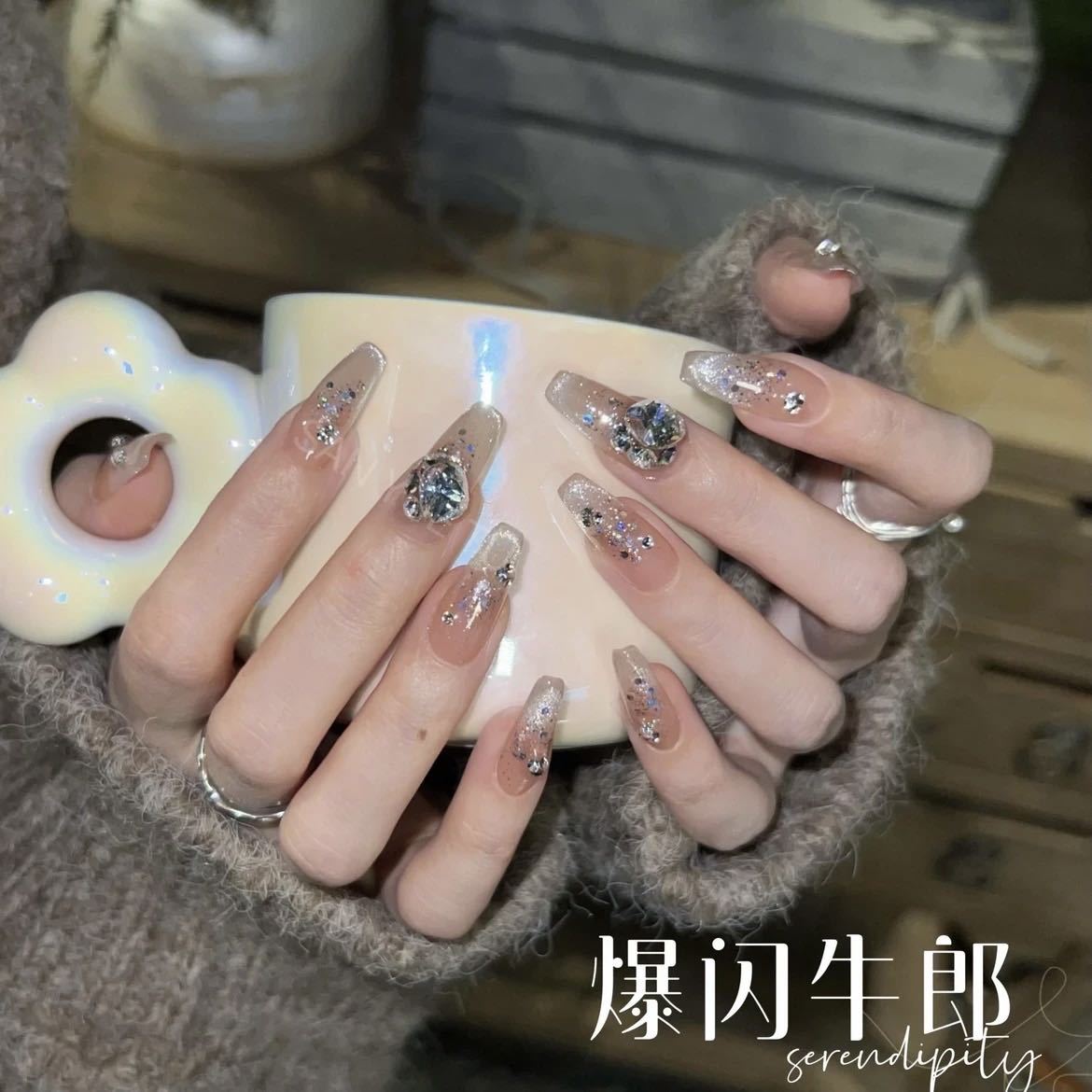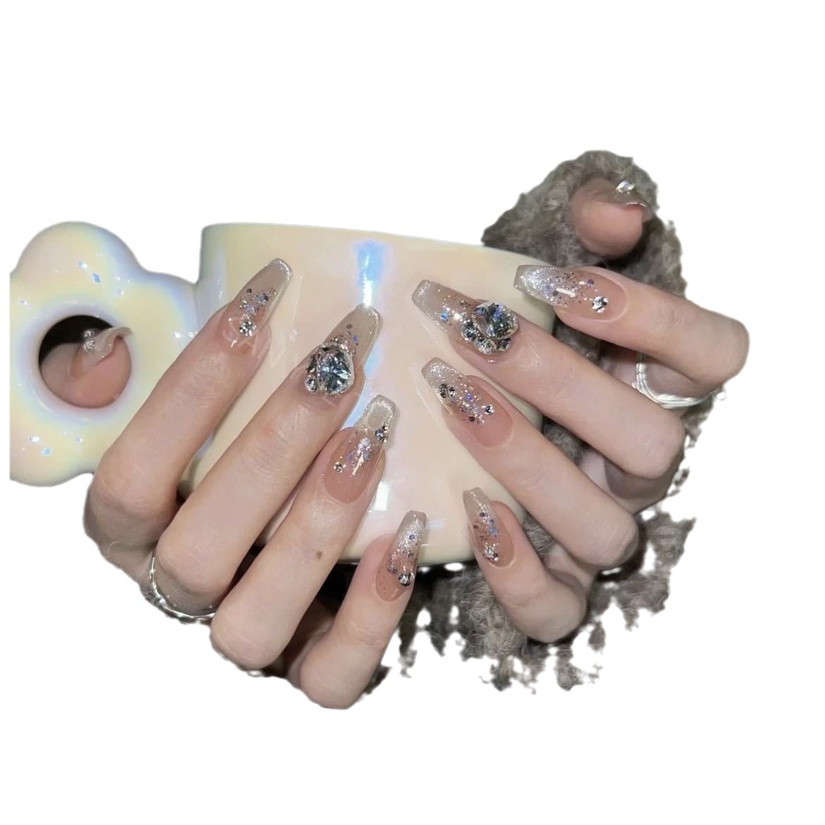 纯手工穿戴甲人间白茶琥珀晕染轻奢银箔细闪珍珠美钻纯欲千金美甲