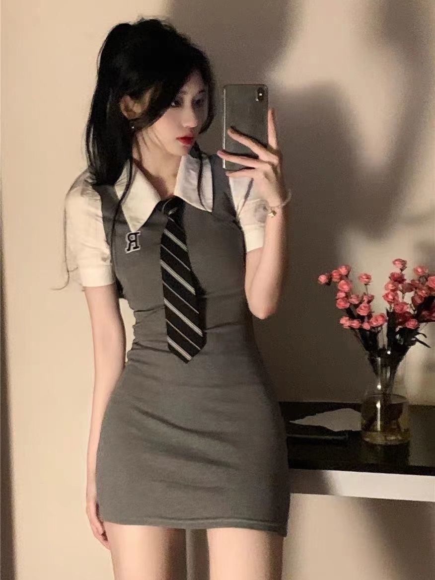 jk纯欲polo领带假两件短袖收腰显瘦修身紧包臀学院风连衣裙女夏季