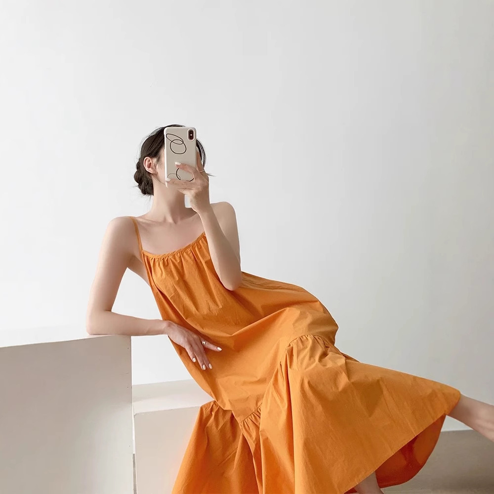 橘子汽水夏日度假风吊带裙女夏季澳棉大裙摆连衣裙宽松露背沙滩裙