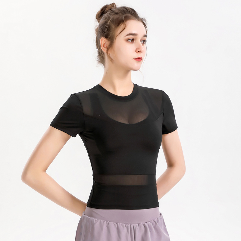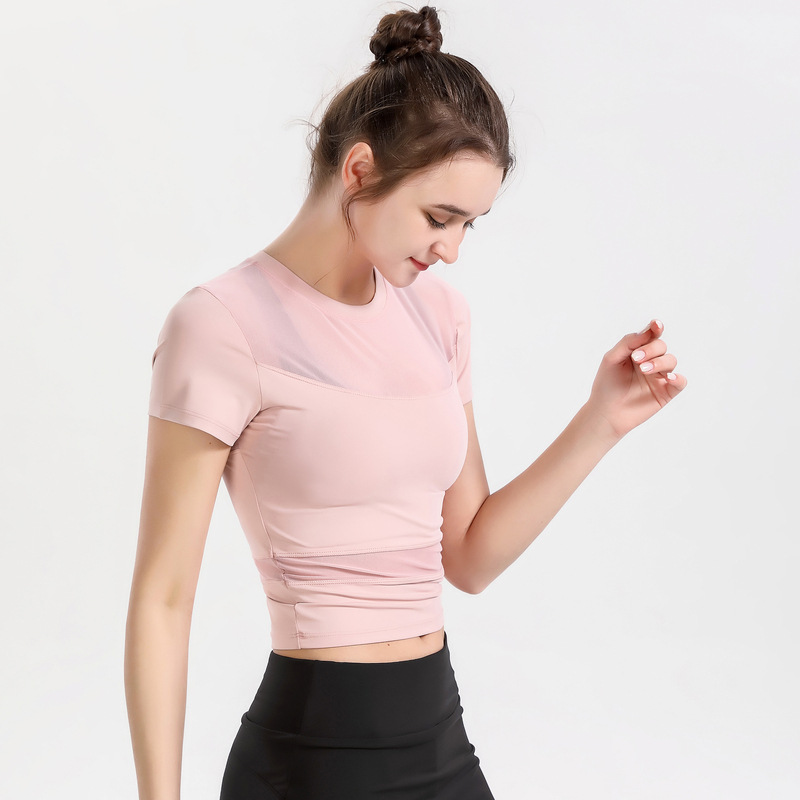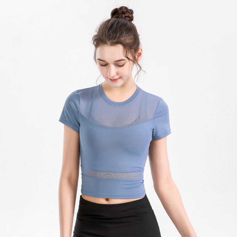 瑜伽运动休闲健身跑步上衣女短袖弹力训练透气速干网纱露脐T恤女