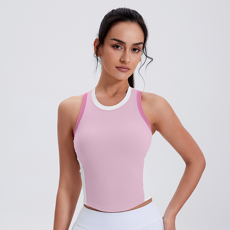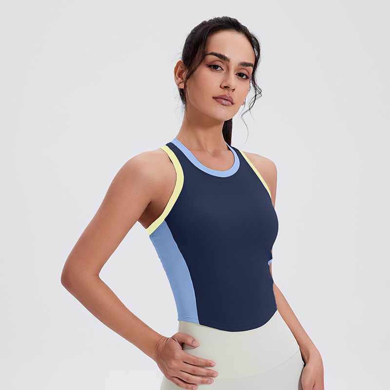 夏圆领撞色拼接运动背心带胸垫休闲跑步健身运动上衣瑜伽服女
