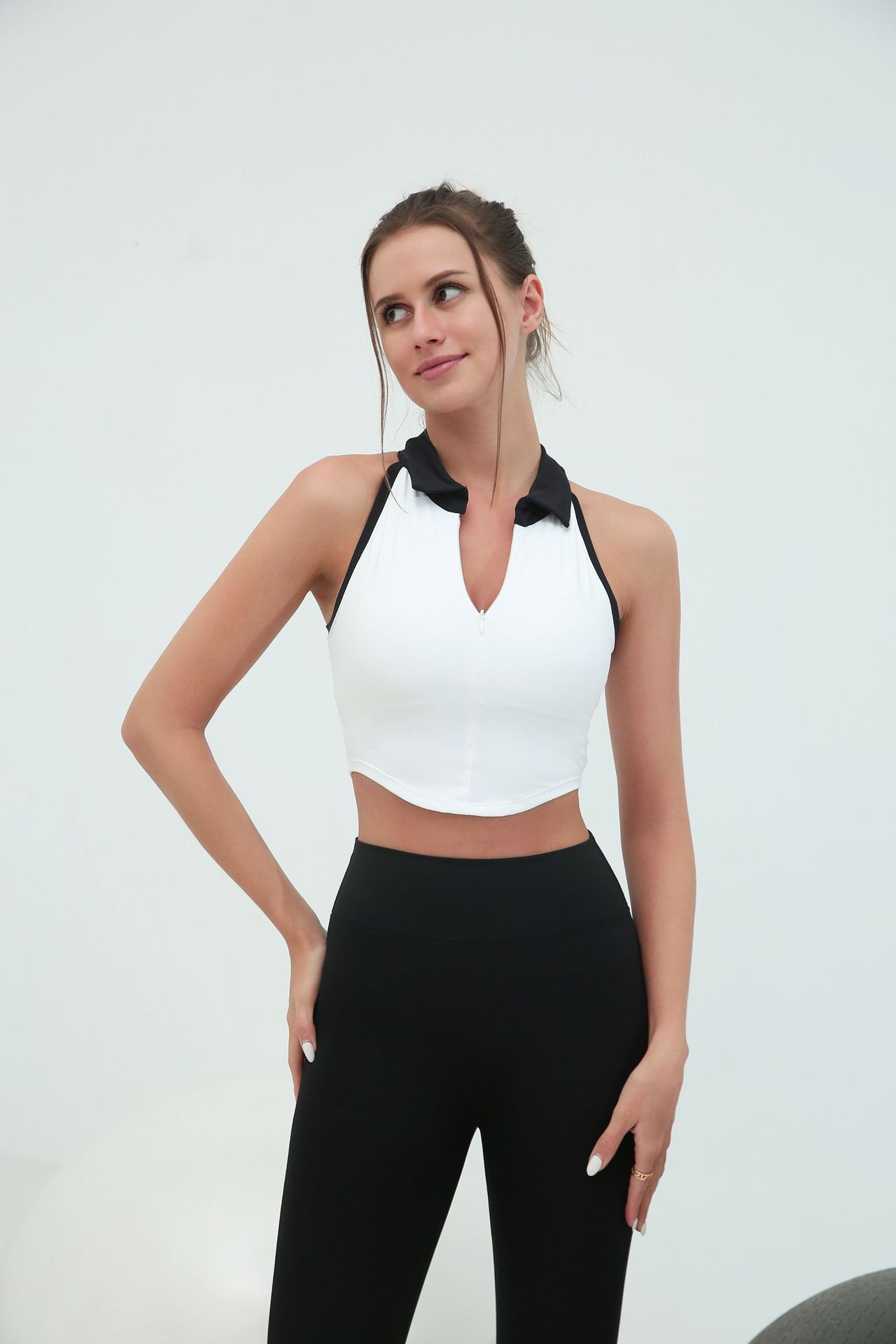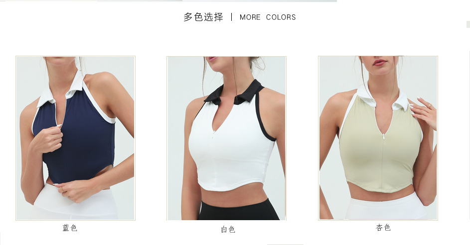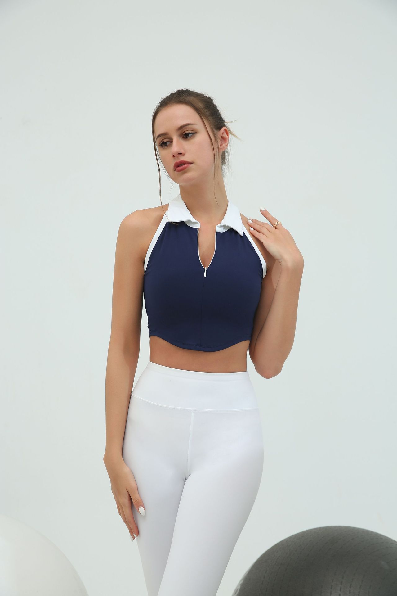 外贸翻领撞色高弹速干运动健身背心女 含胸垫瑜伽训练不规则上衣