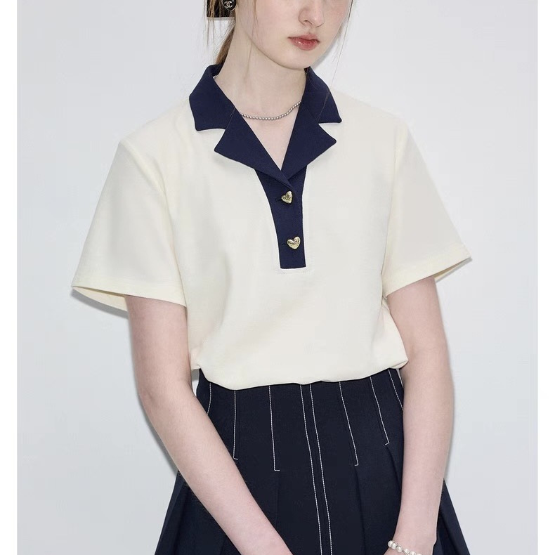VEGA 短袖T恤女2025年夏季新款复古时髦撞色POLO领正肩上衣
