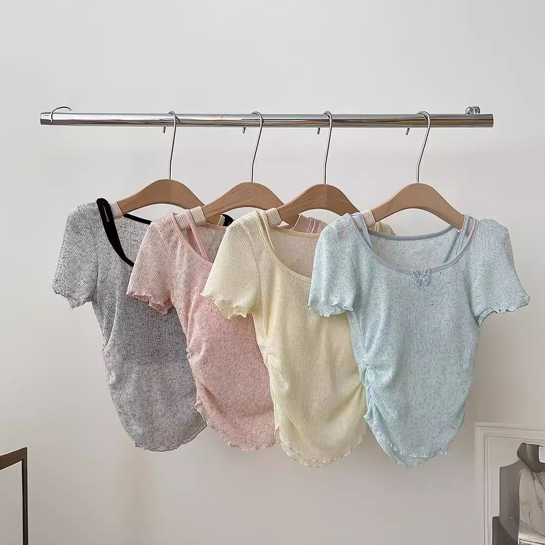 纯欲薄款微透蓝色短袖T恤女夏季带胸垫吊带小背心上衣叠穿两件套