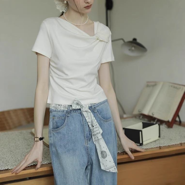不对称纯色斜肩扭结短袖T恤女夏新款修身显瘦百搭休闲上衣