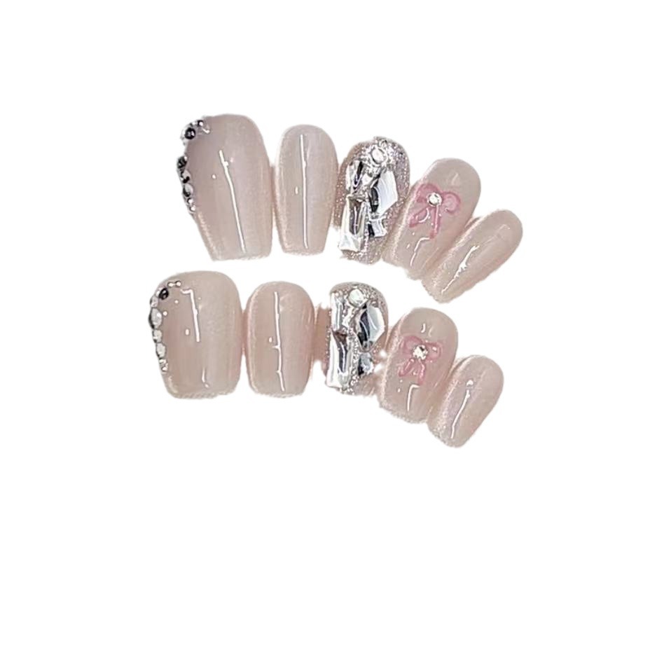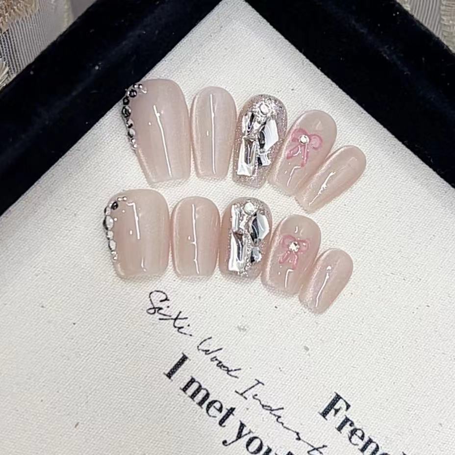 纯手工光疗穿戴甲粉色系带果批发成品重复使用美甲贴片可拆卸猫