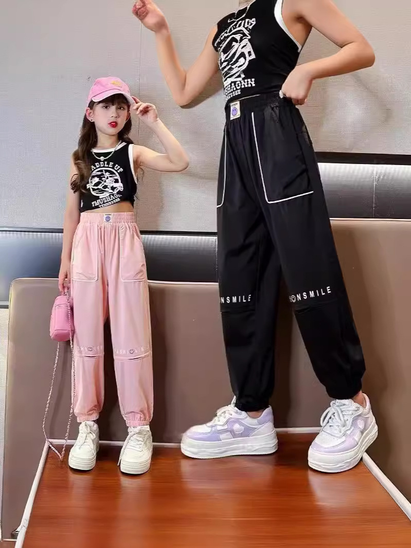 女童美式复古粉色多口袋薄款工装裤童装薄款冰丝直筒休闲防蚊裤子