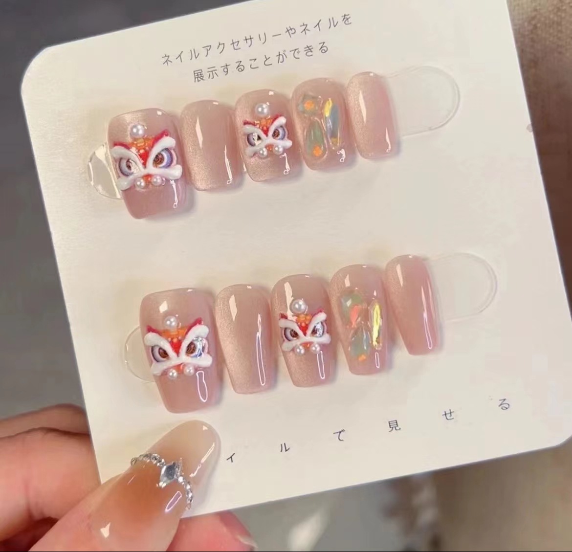 纯手工光疗穿戴甲发财醒狮穿戴甲批发成品重复使用美甲贴片可拆卸