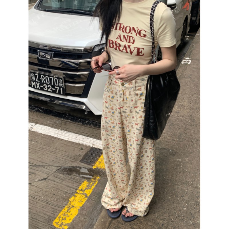 诠释美NEW OPEN复古港风长裤女夏卡通动物可爱直筒裤子82521