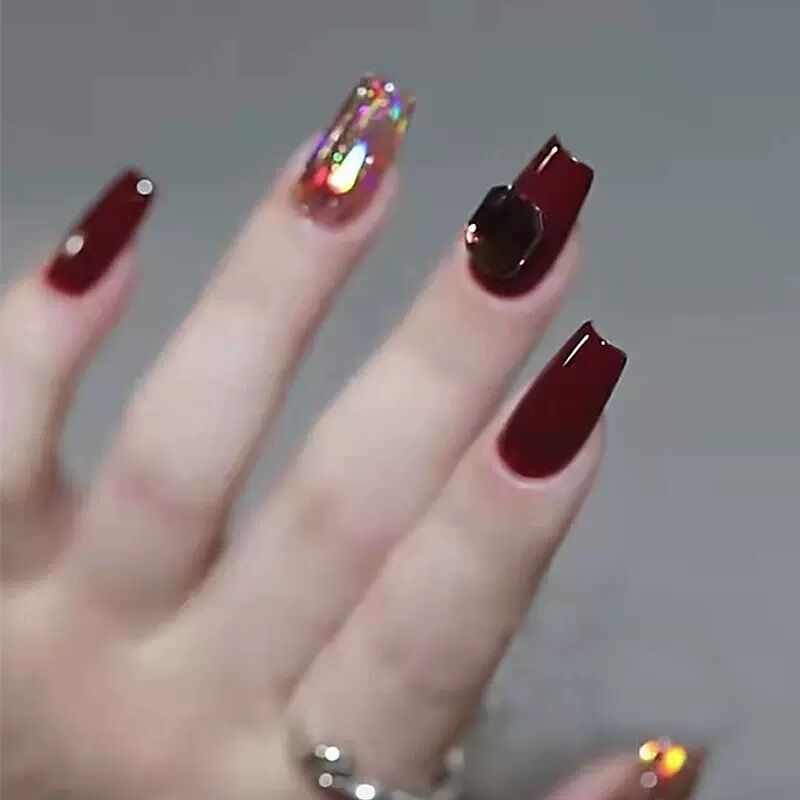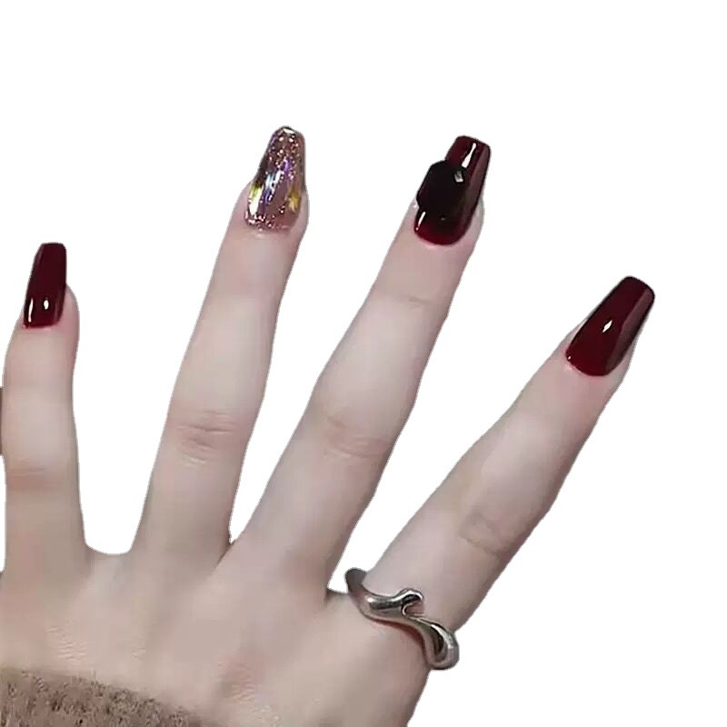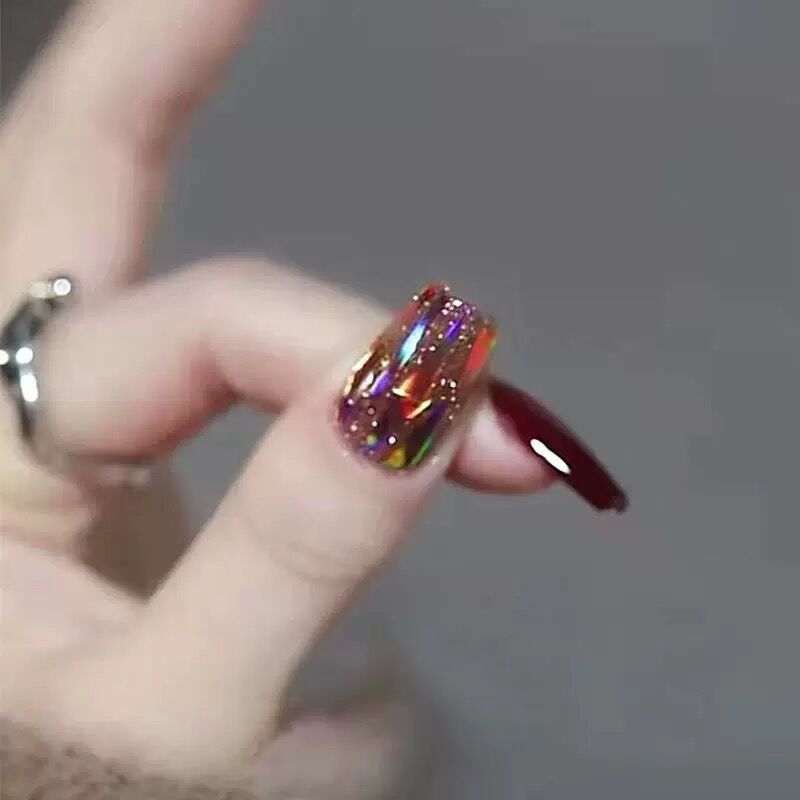 纯手工光疗穿戴甲 酒红幻彩穿戴甲批发成品重复使用美甲贴片