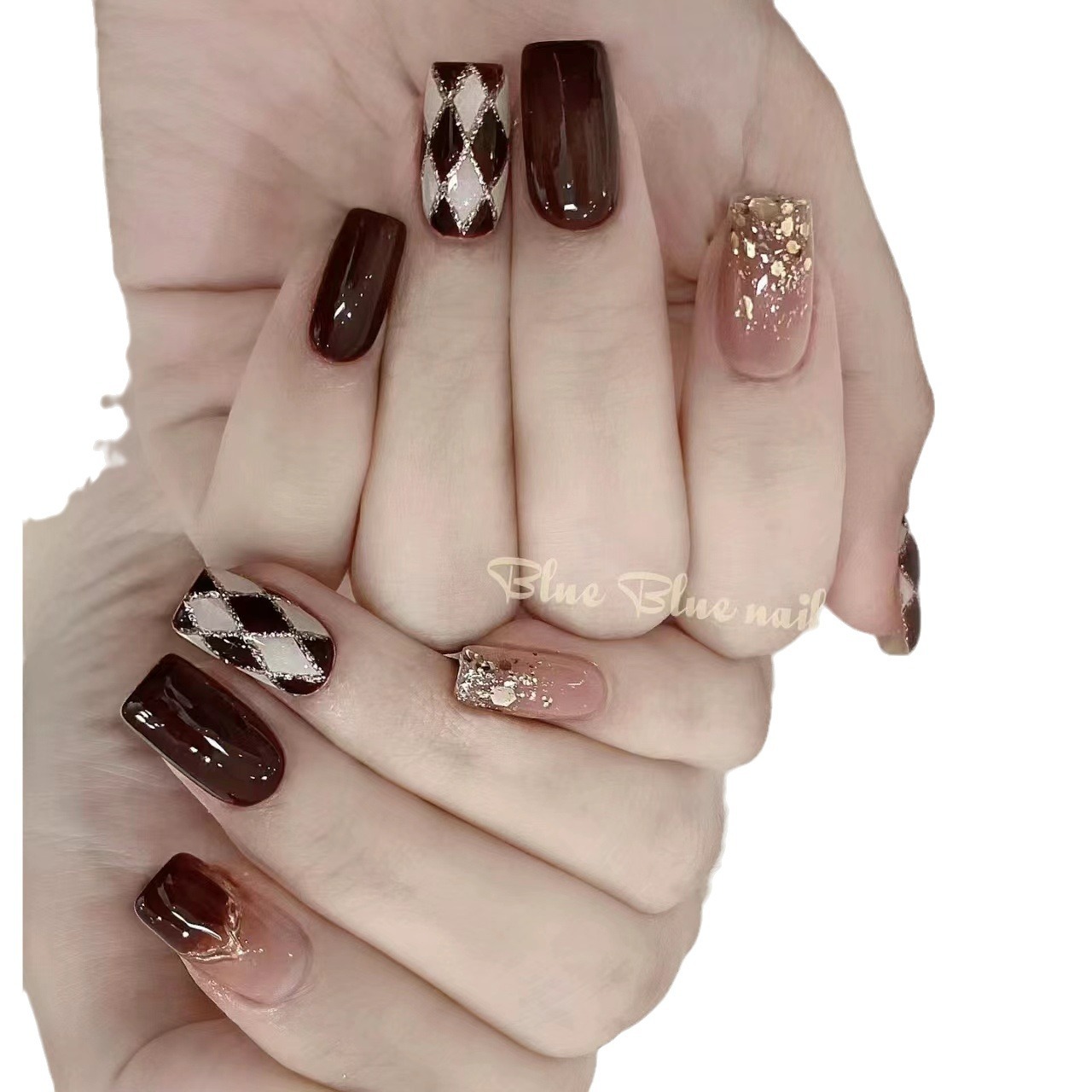 纯手工光疗穿戴甲菱形格穿戴甲批发成品重复使用美甲贴片可拆卸