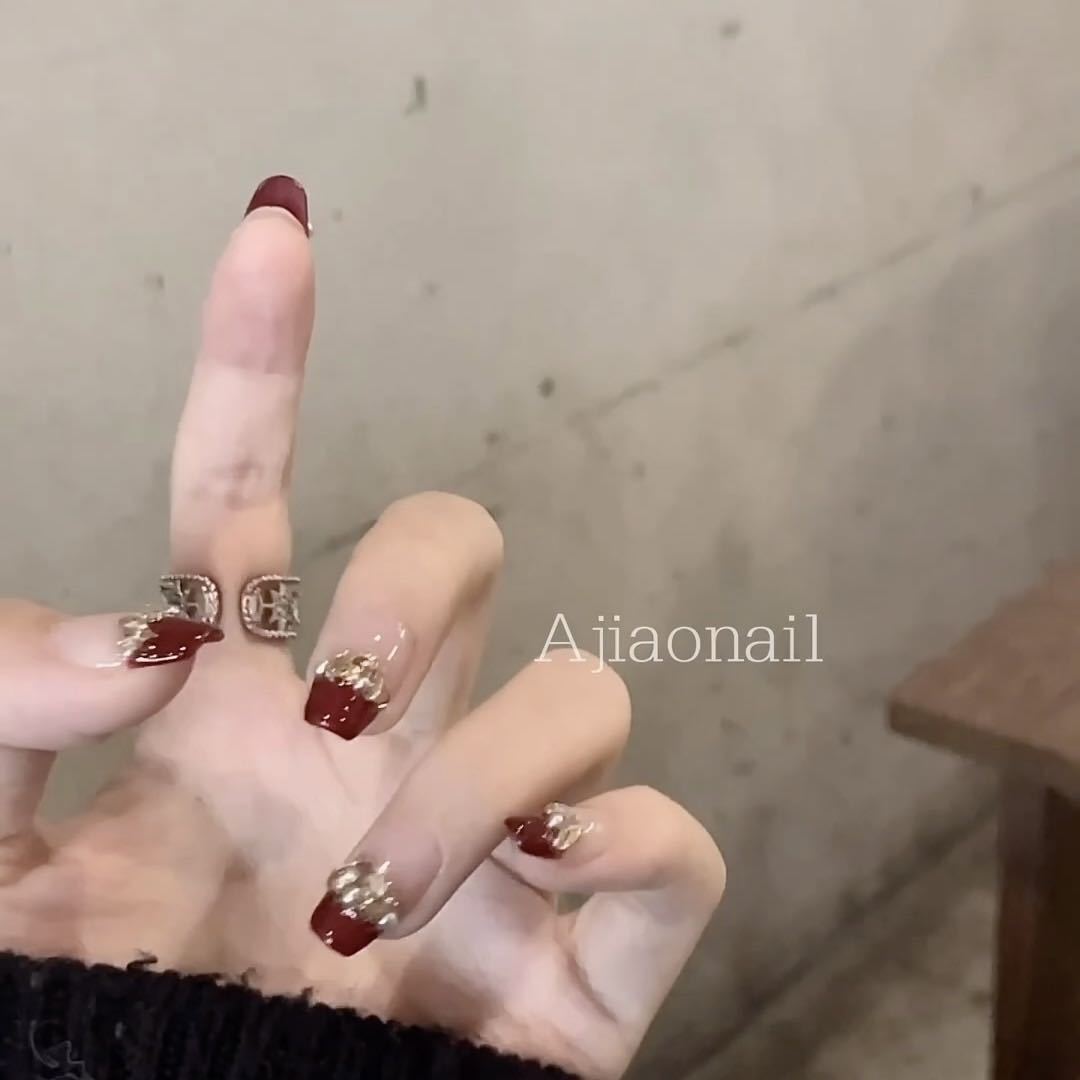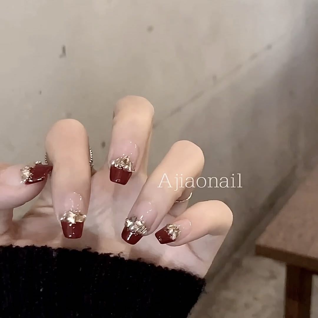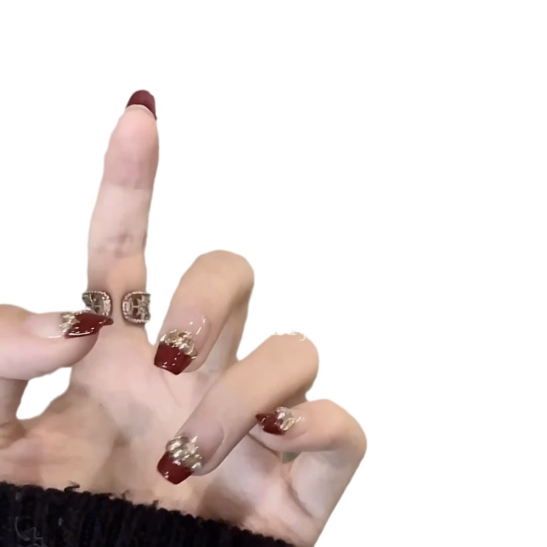 纯手工光疗穿戴甲酒红香槟批发成品重复使用美甲贴片可拆卸猫