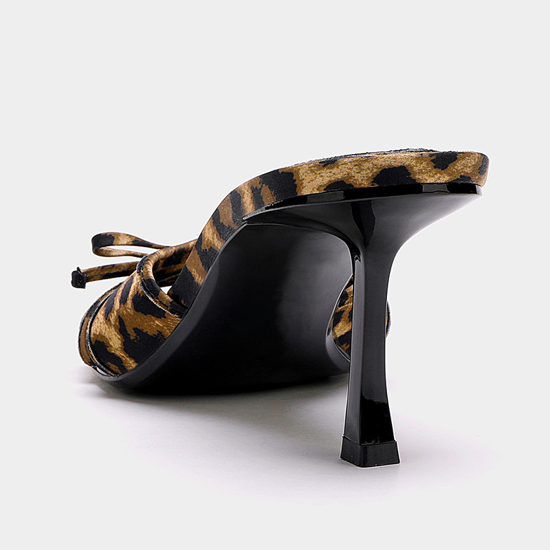 女鞋新款夏季一字带蝴蝶结饰豹纹高跟细跟凉鞋