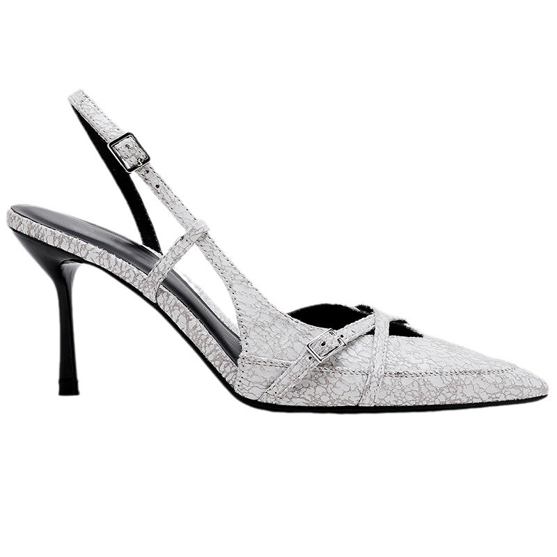 夏季新款法式包头鞋细高跟蓝色牛仔布尖头交叉带凉鞋