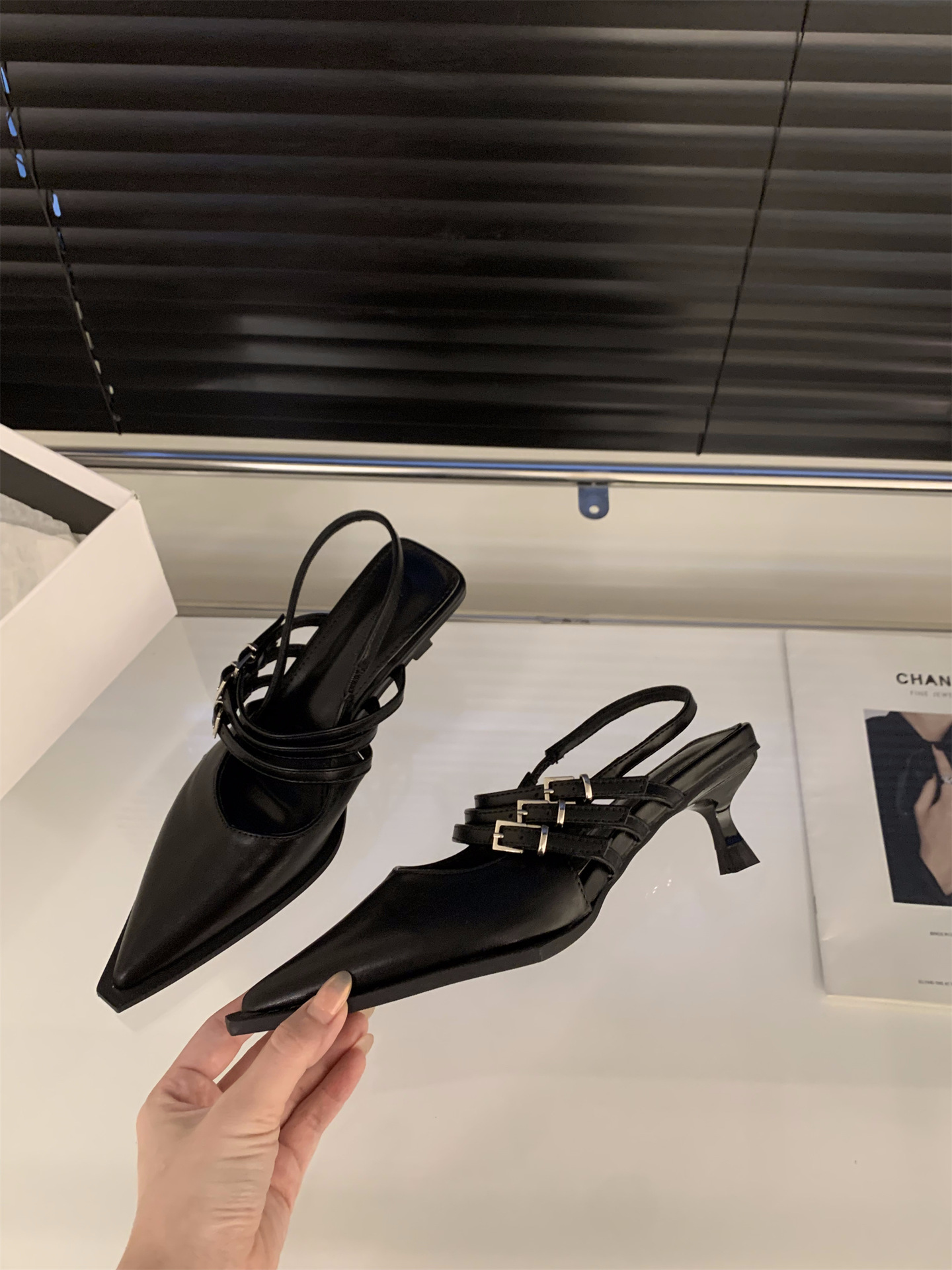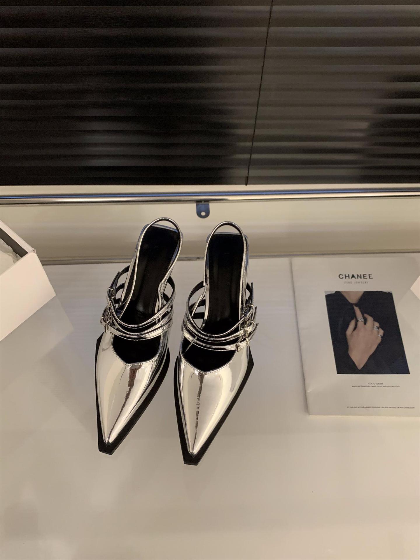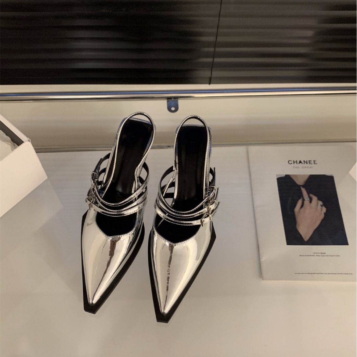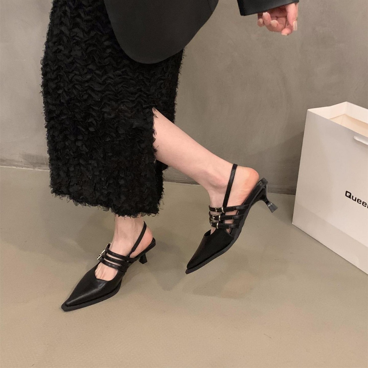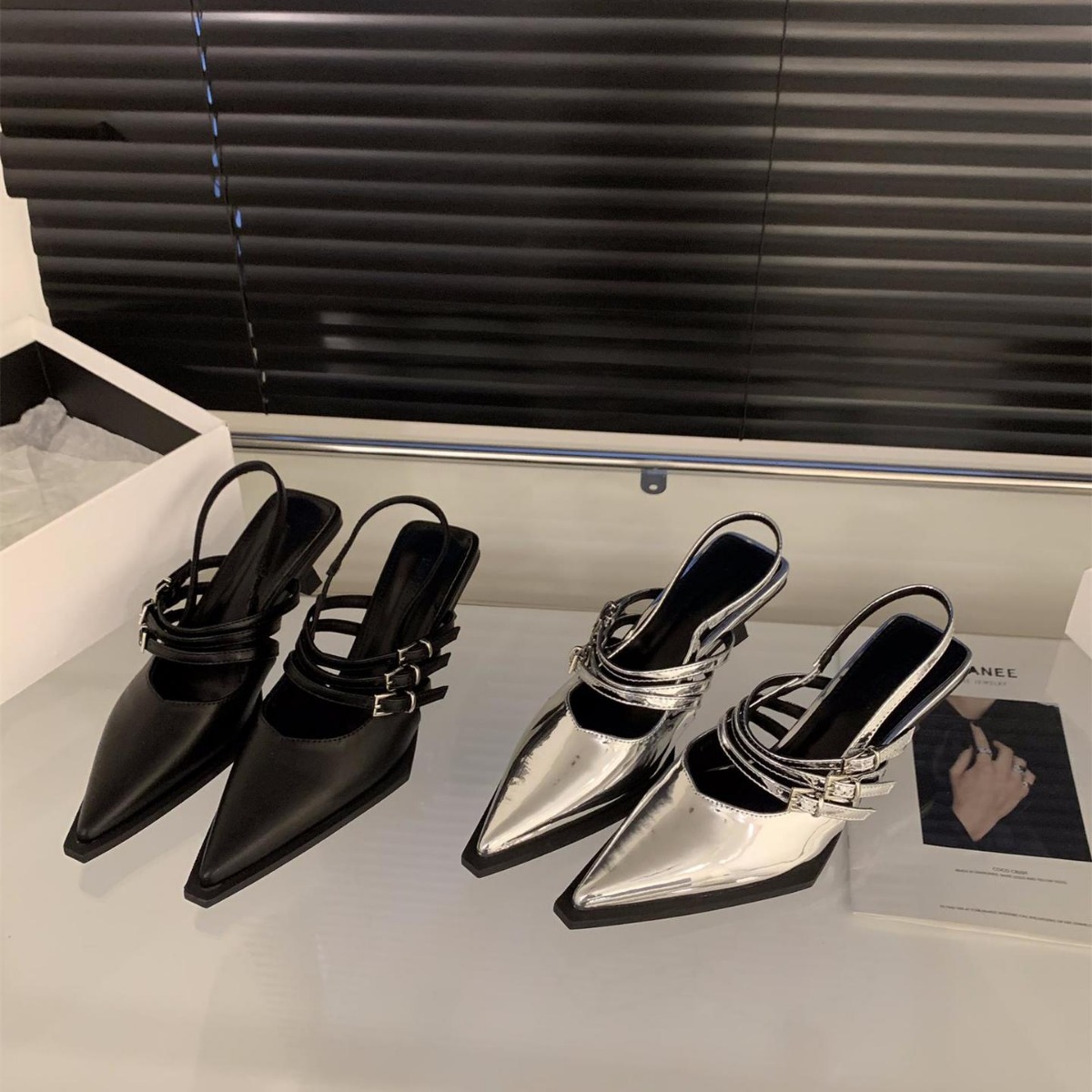 法式小猫跟高跟鞋银色凉鞋仙女鞋子新款尖头气质黑色后空单鞋