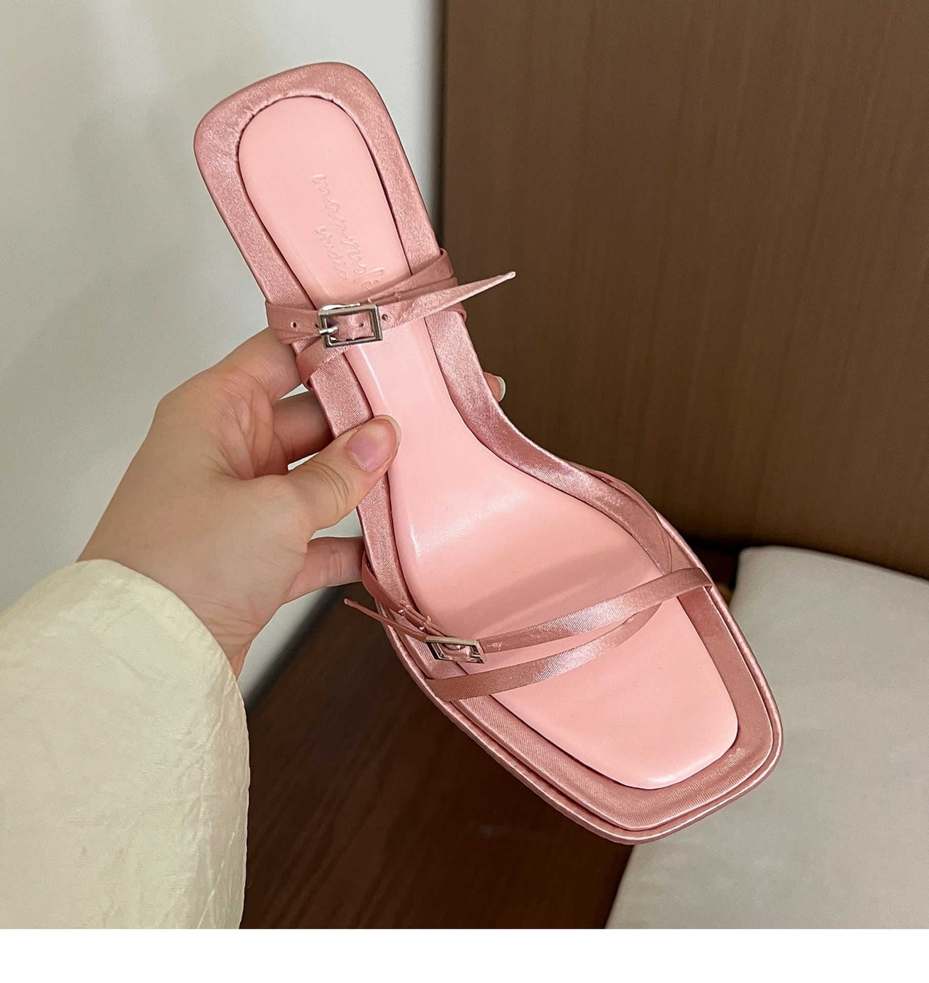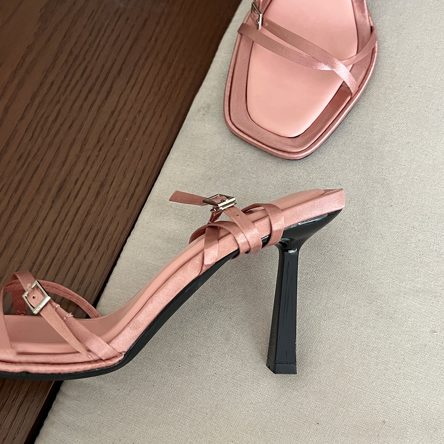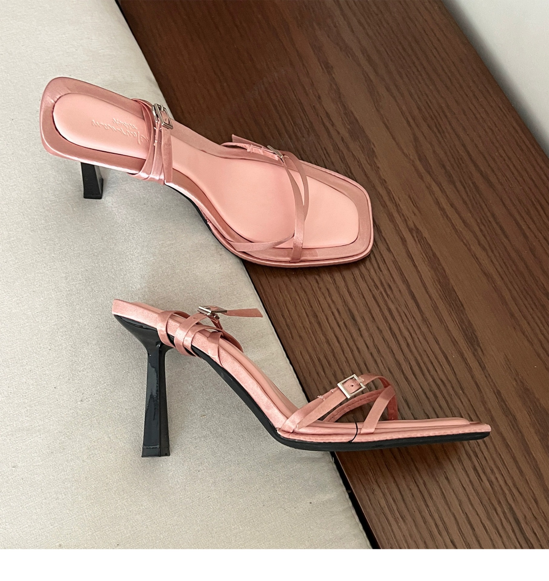 温柔贵气感!银色一字带凉鞋女夏季绸缎细跟高跟鞋子