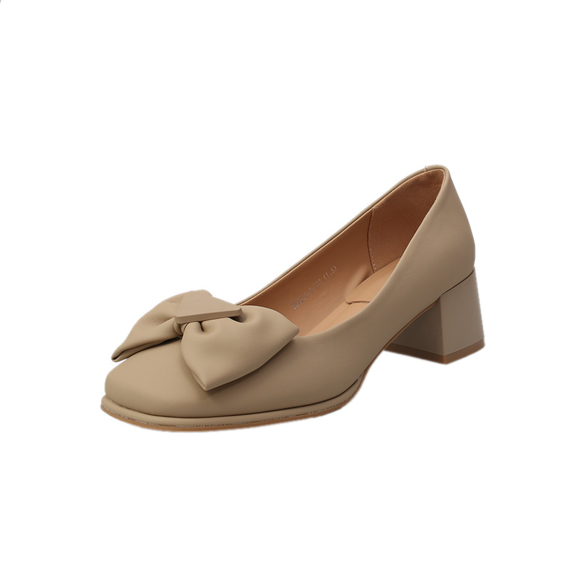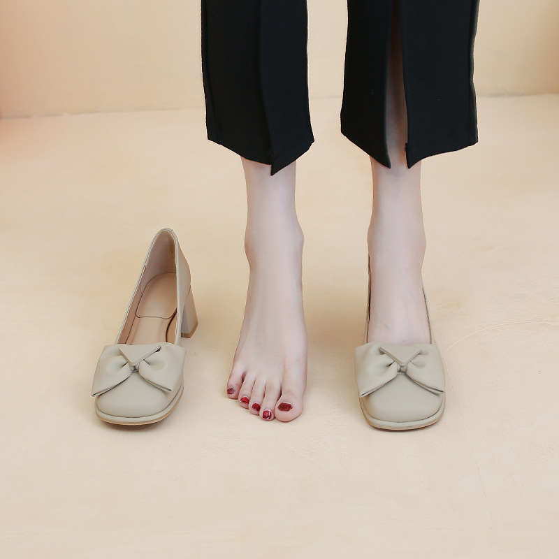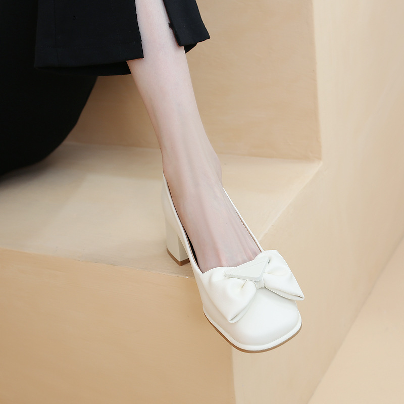 法式复古蝴蝶结方头浅口软皮奶奶鞋新款夏季中粗跟百搭单鞋女
