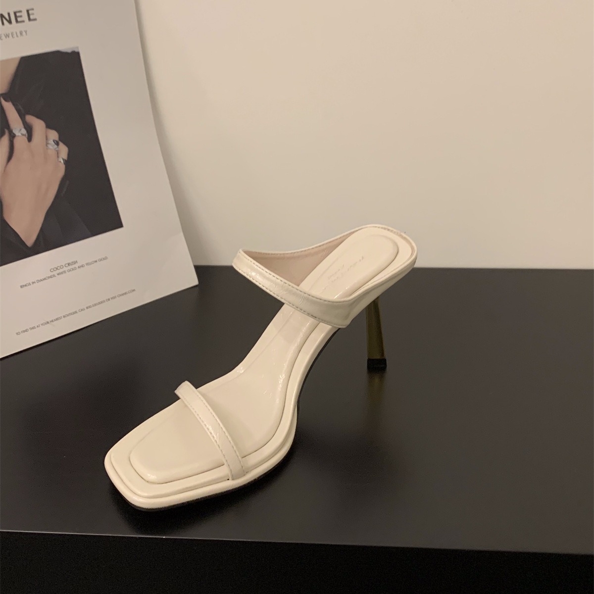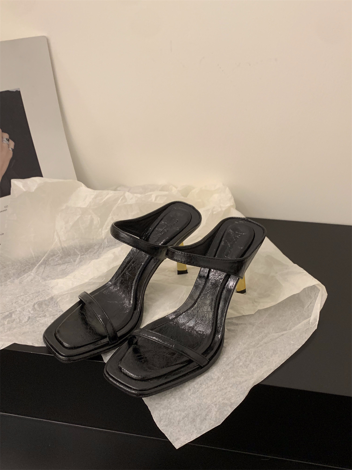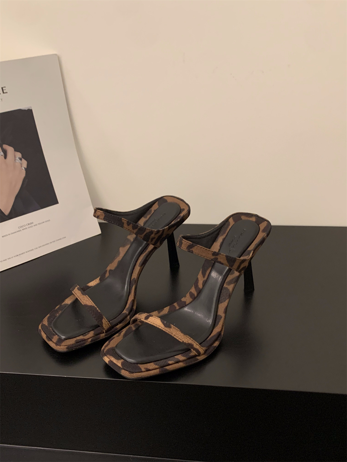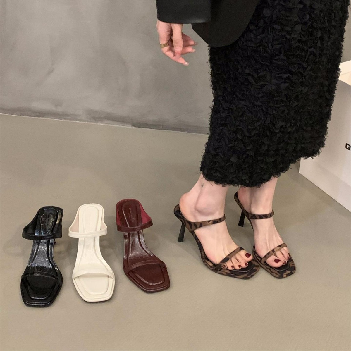 小众法式豹纹高跟鞋一字拖鞋女鞋子外穿新款夏季细跟凉拖凉鞋