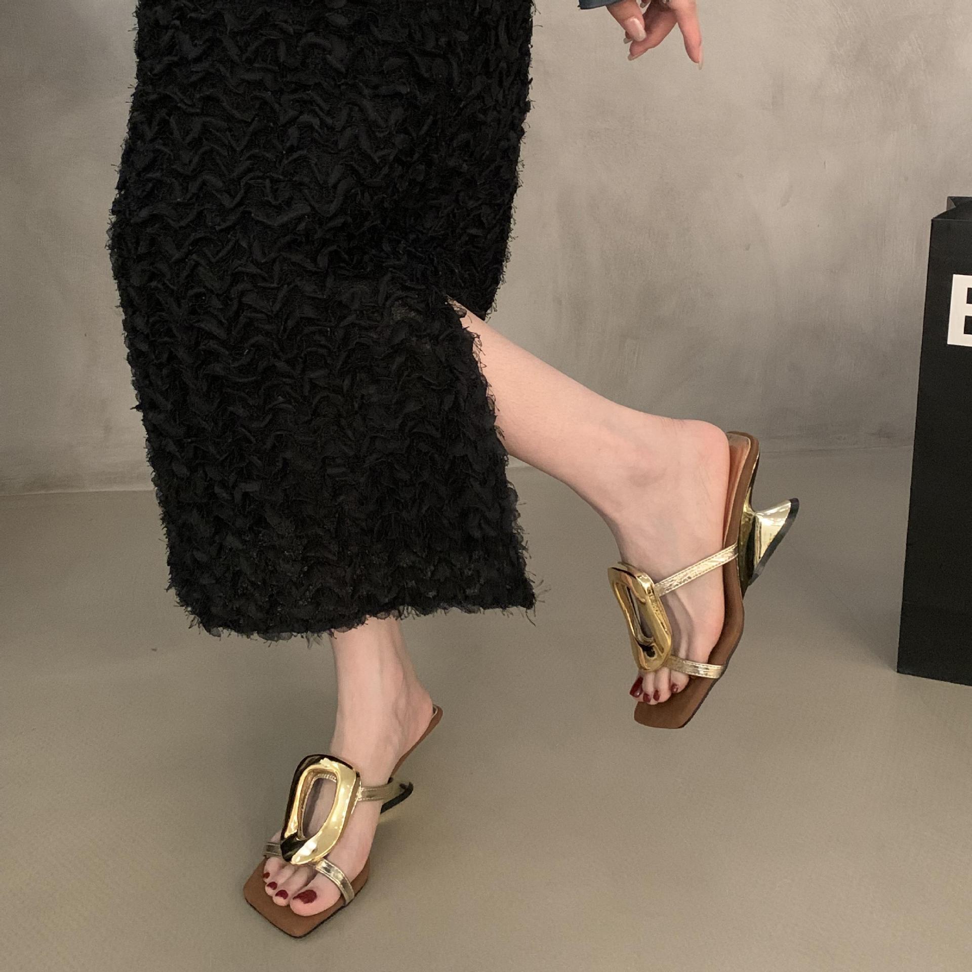 法式金属方扣时尚凉拖鞋外穿夏季新款方头露趾坡跟高跟凉鞋女