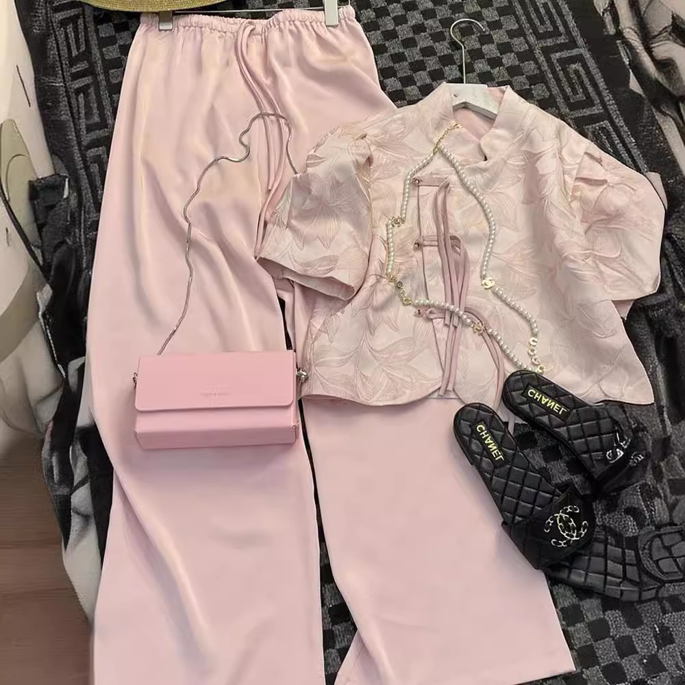 夏季新款新中式国风轻奢清新粉色显瘦盘扣衬衫阔腿裤两件套女