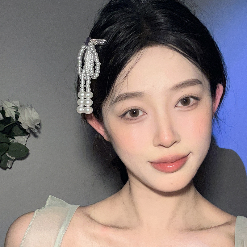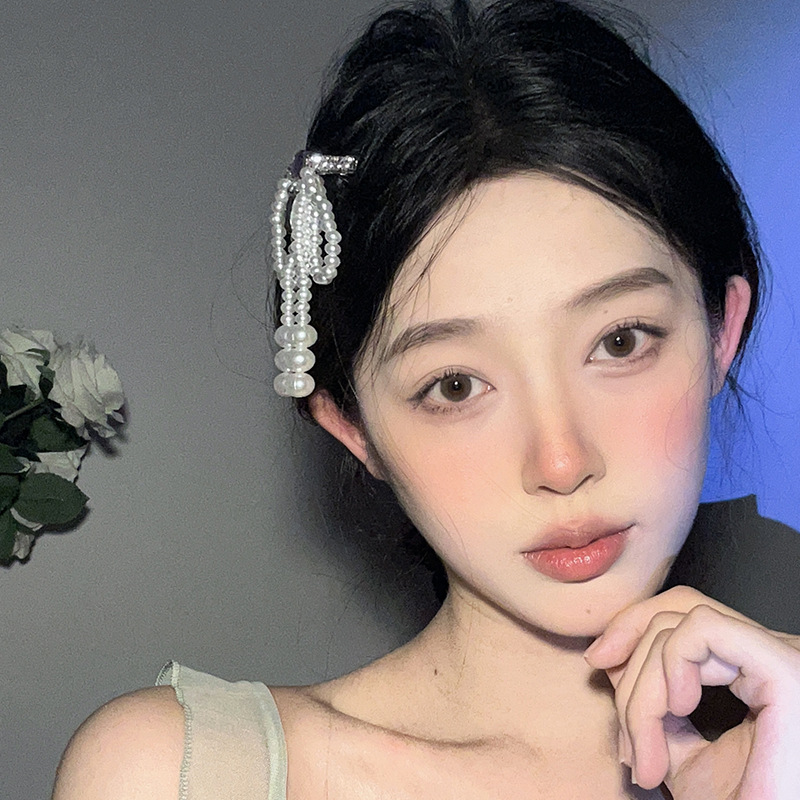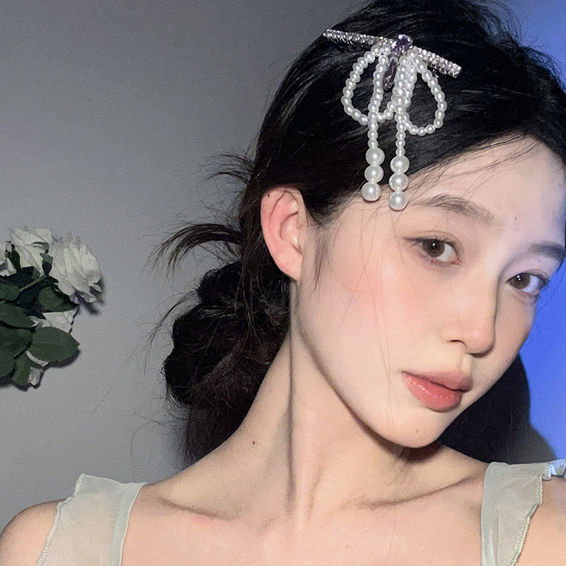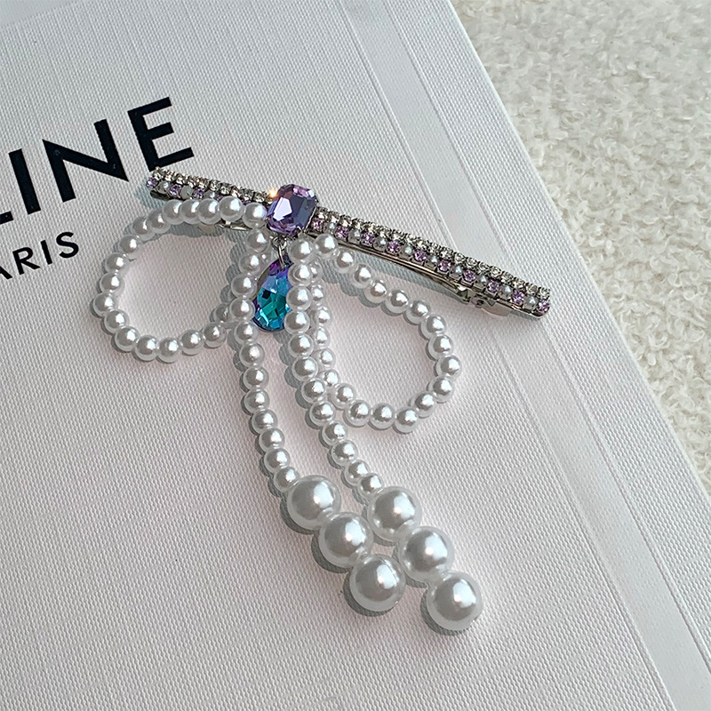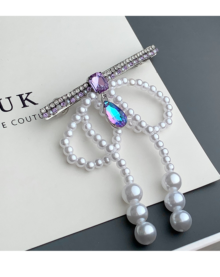 紫色水钻珍珠蝴蝶结发夹小众设计高级感侧边夹发卡弹簧夹新款发饰