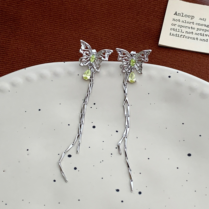 轻奢绿色锆石蝴蝶流苏耳环女小众设计感长款流苏耳坠独特个性耳饰